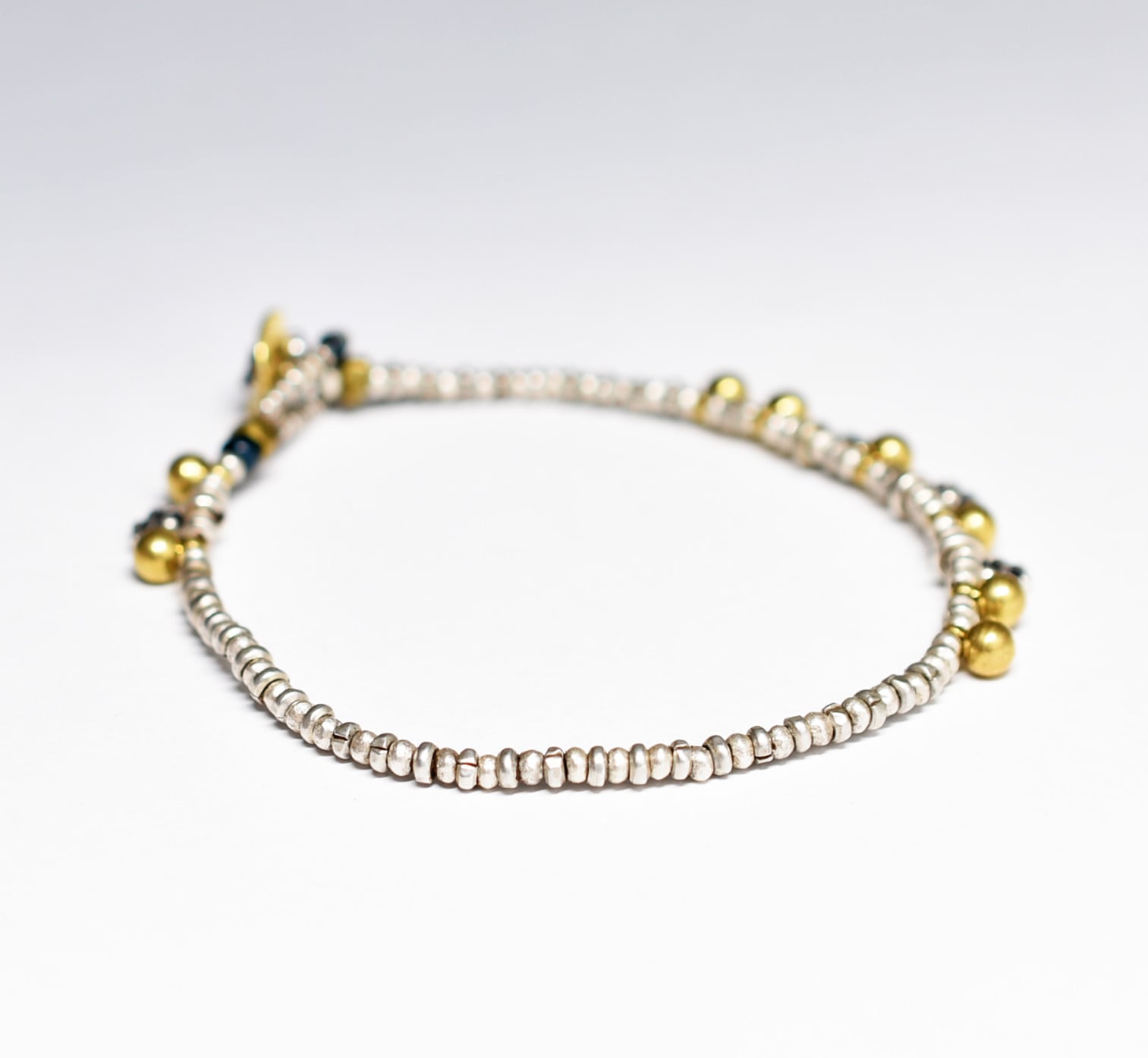 シャン族oldシルバーとカレンシルバー、まん丸インドブラス&インドシルバー小花、oldオリッサブラス、インディゴブルービーズのブレス