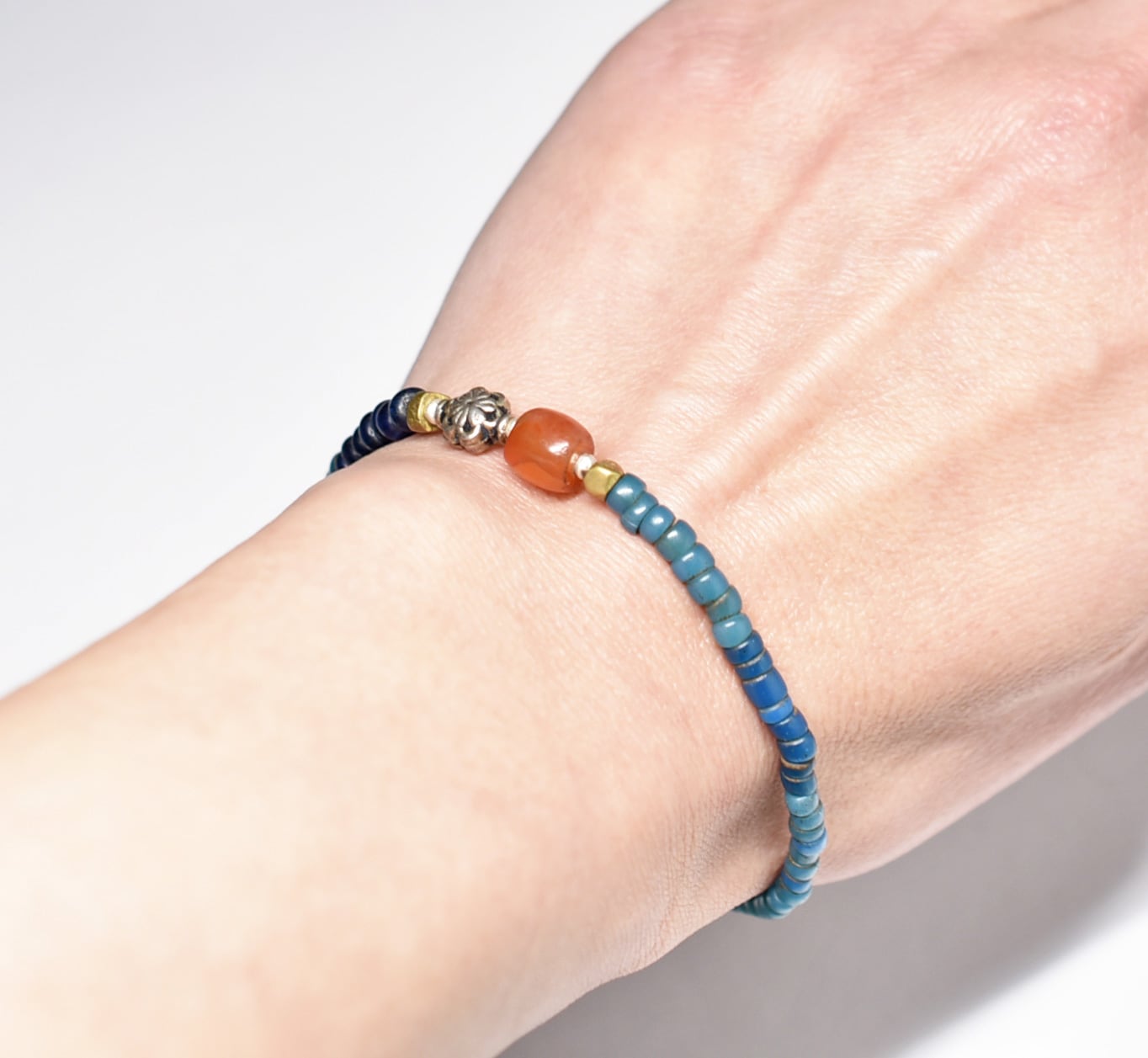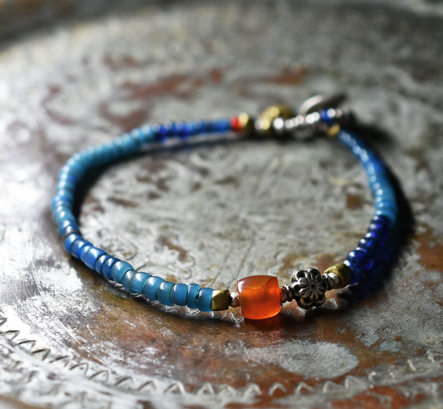 ミゾーラムカーネリアンと花模様インドシルバー、ナガ族アンティークビーズ、ブルービーズのブレス