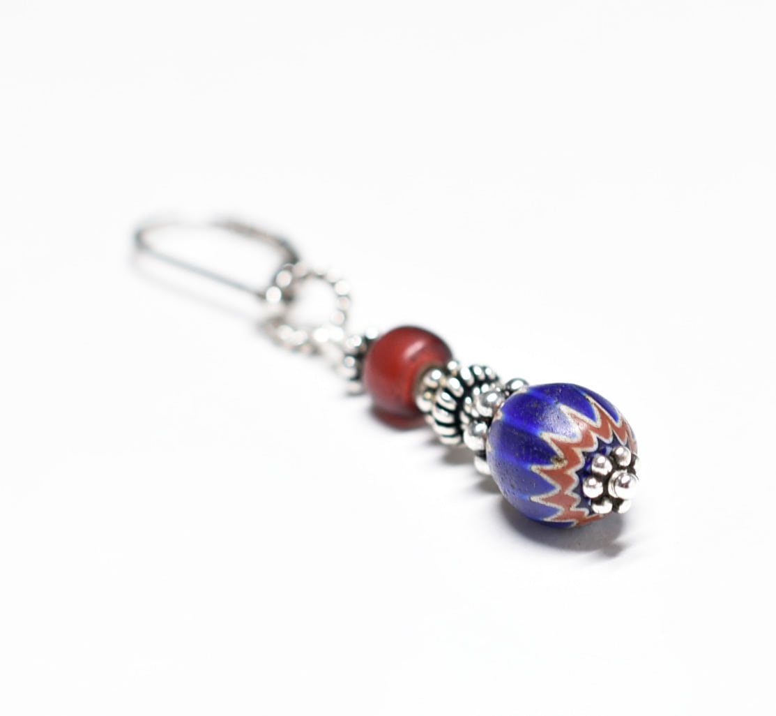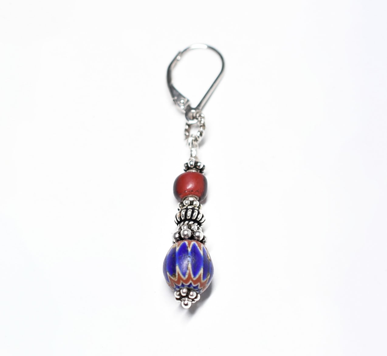 コロロンと丸いアンティークシェブロンビーズと金赤ホワイトハーツ、シルバービーズを繋いだ片耳ピアスです。