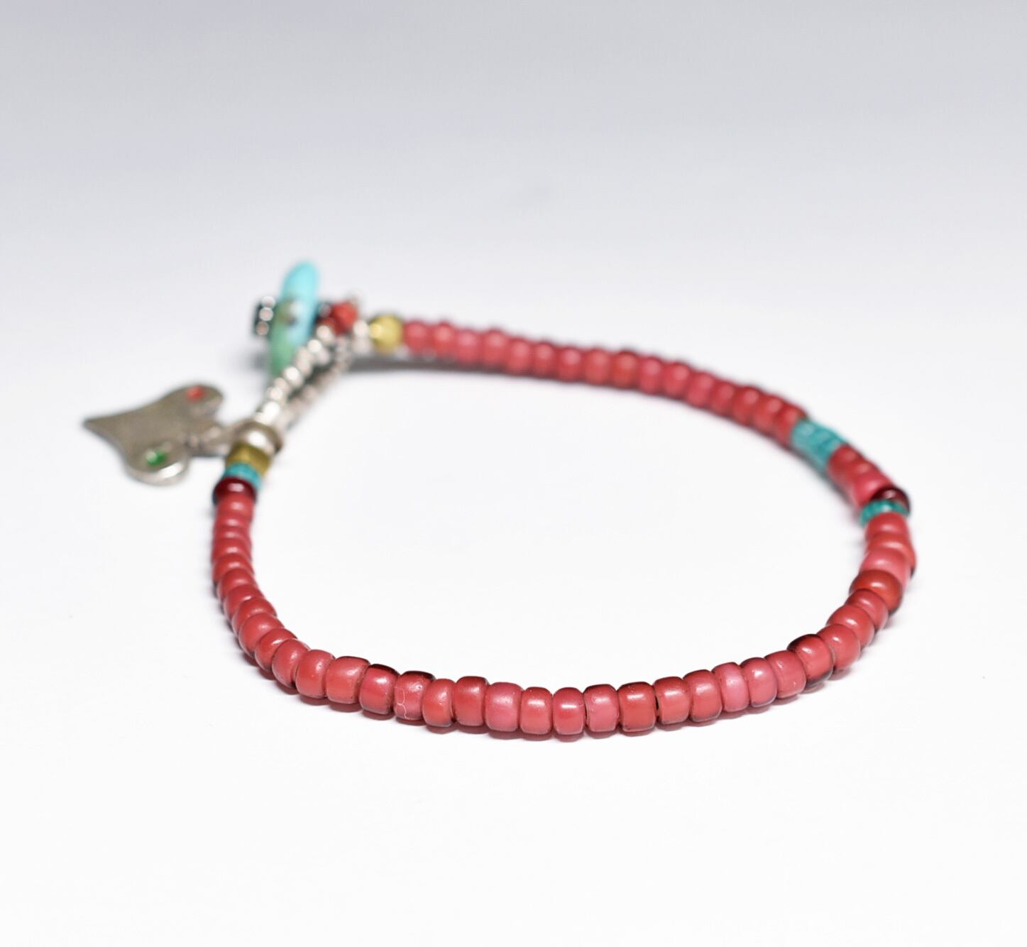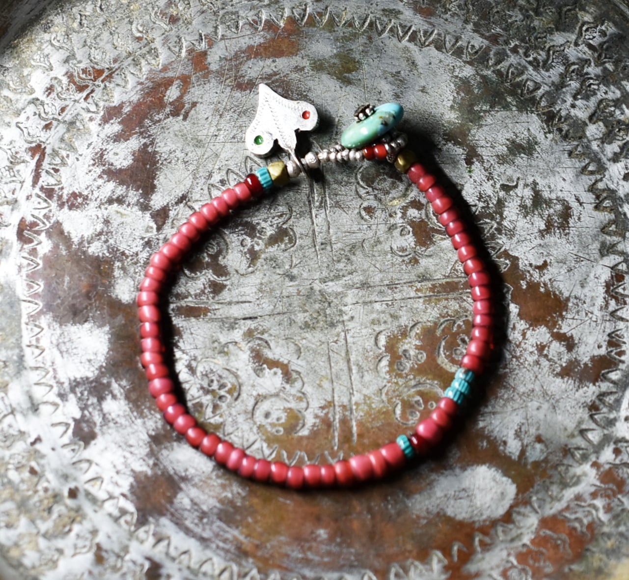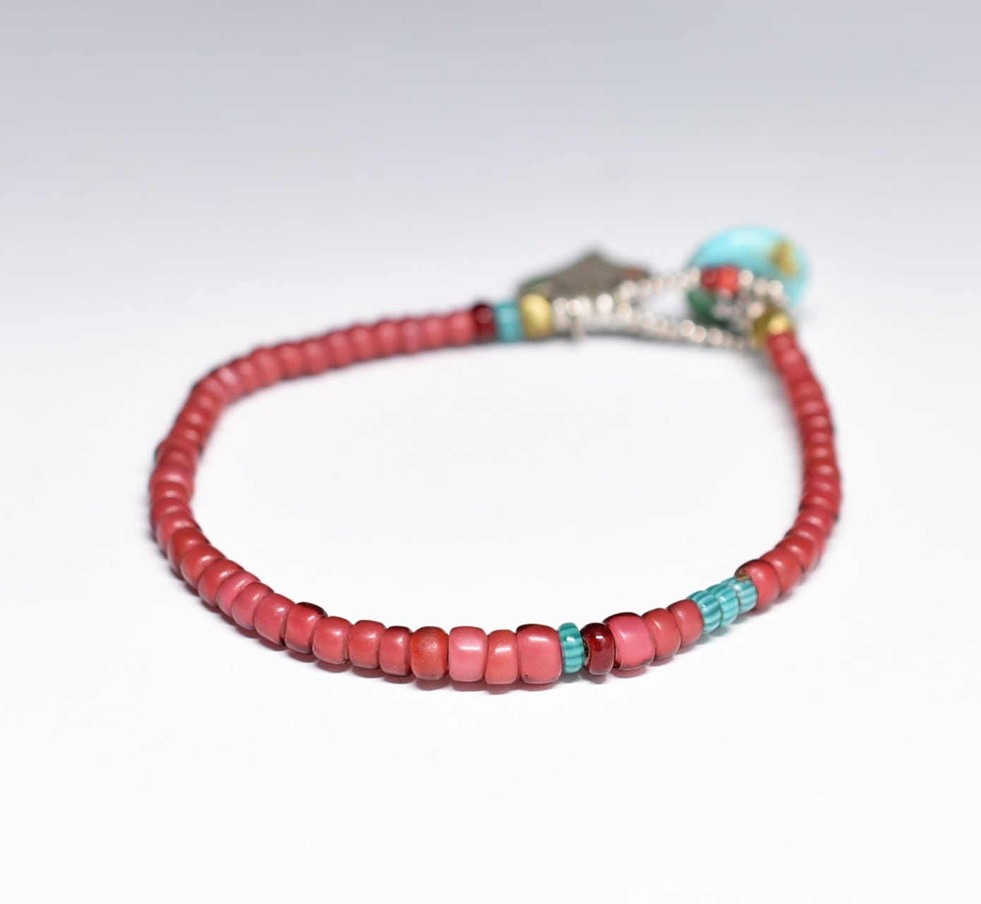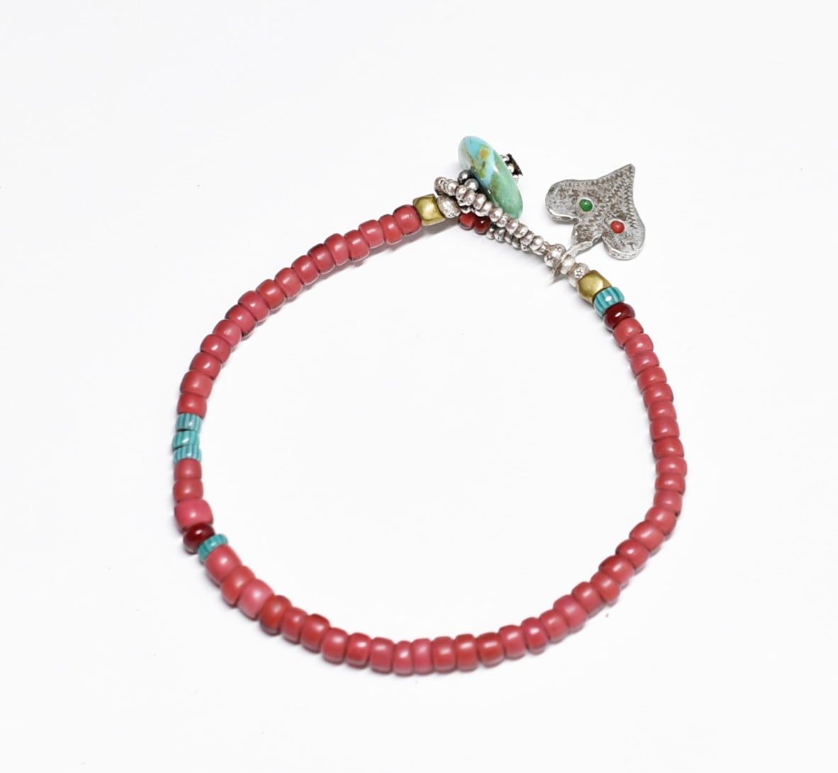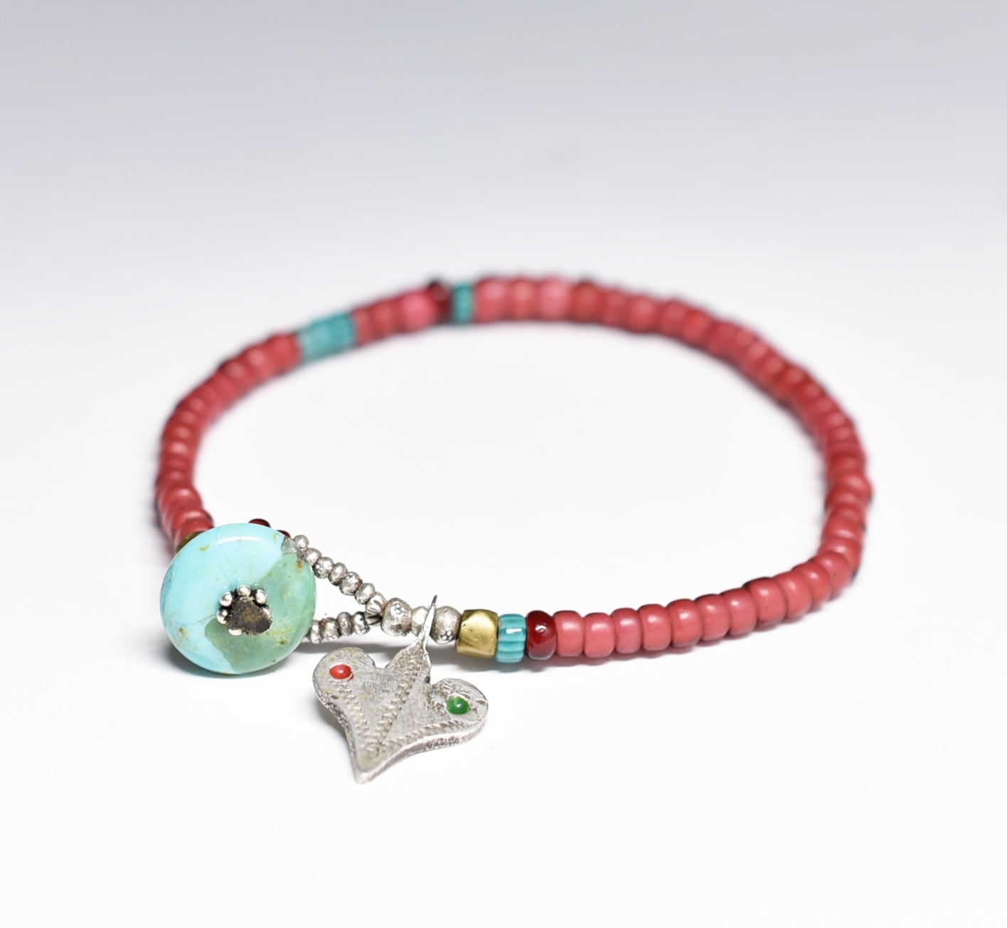 oldベルベル族ヴィンテージシルバー、金赤&濃赤ホワイトハーツ、ターコイズシェブロンビーズのブレス(ターコイズ留め金)