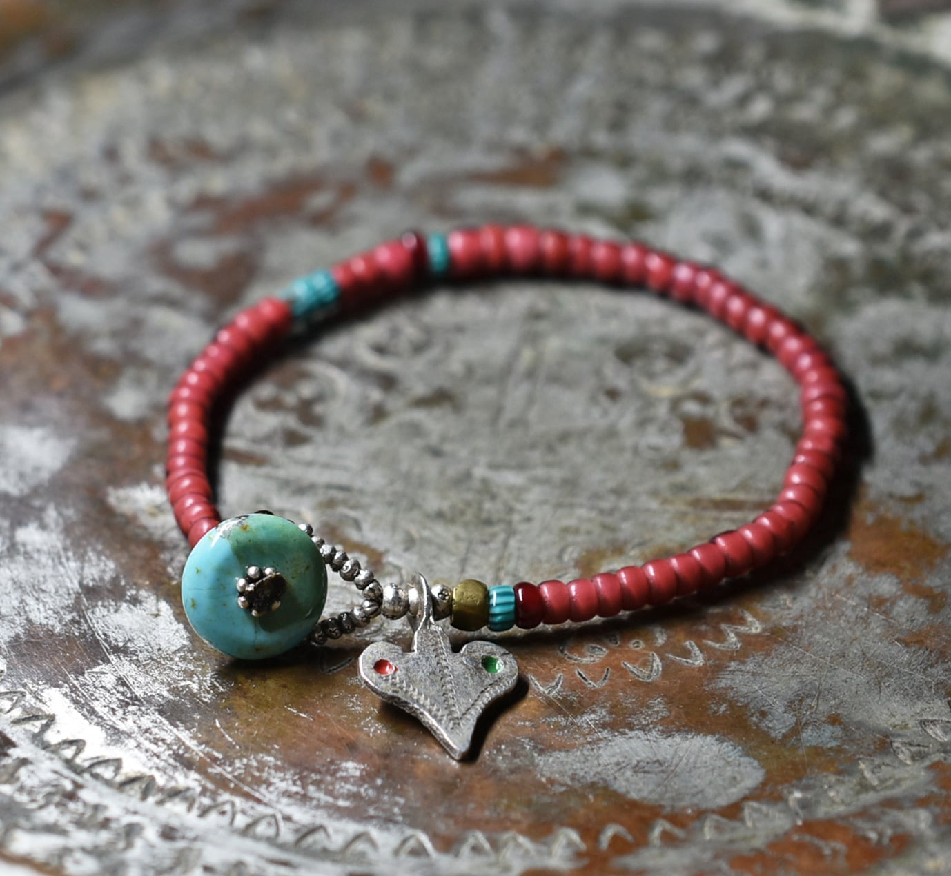oldベルベル族ヴィンテージシルバー、金赤&濃赤ホワイトハーツ、ターコイズシシェブロンビーズなどを繋いだブレスです。