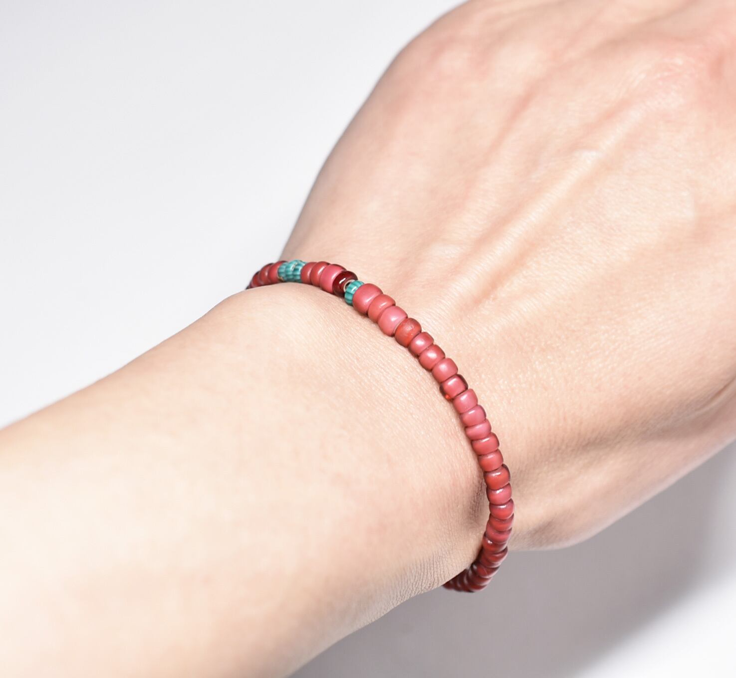赤色のビーズはアンティークホワイトハーツです。(芯部分が白いんです)。