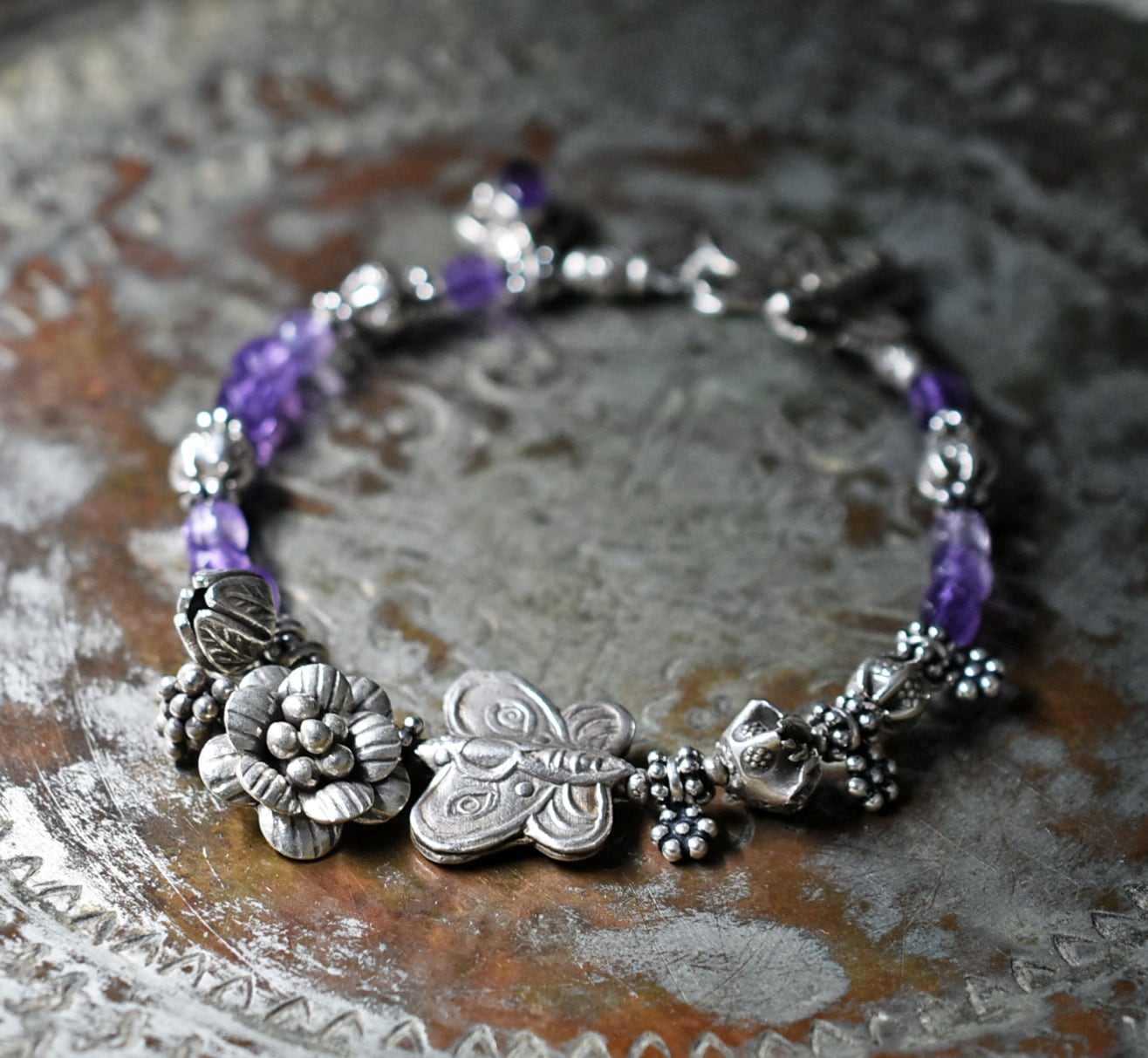 蝶&お花、多彩カレンシルバー、アメジスト、シルバー小花、シルバー装飾アメジストを繋いだブレスです。