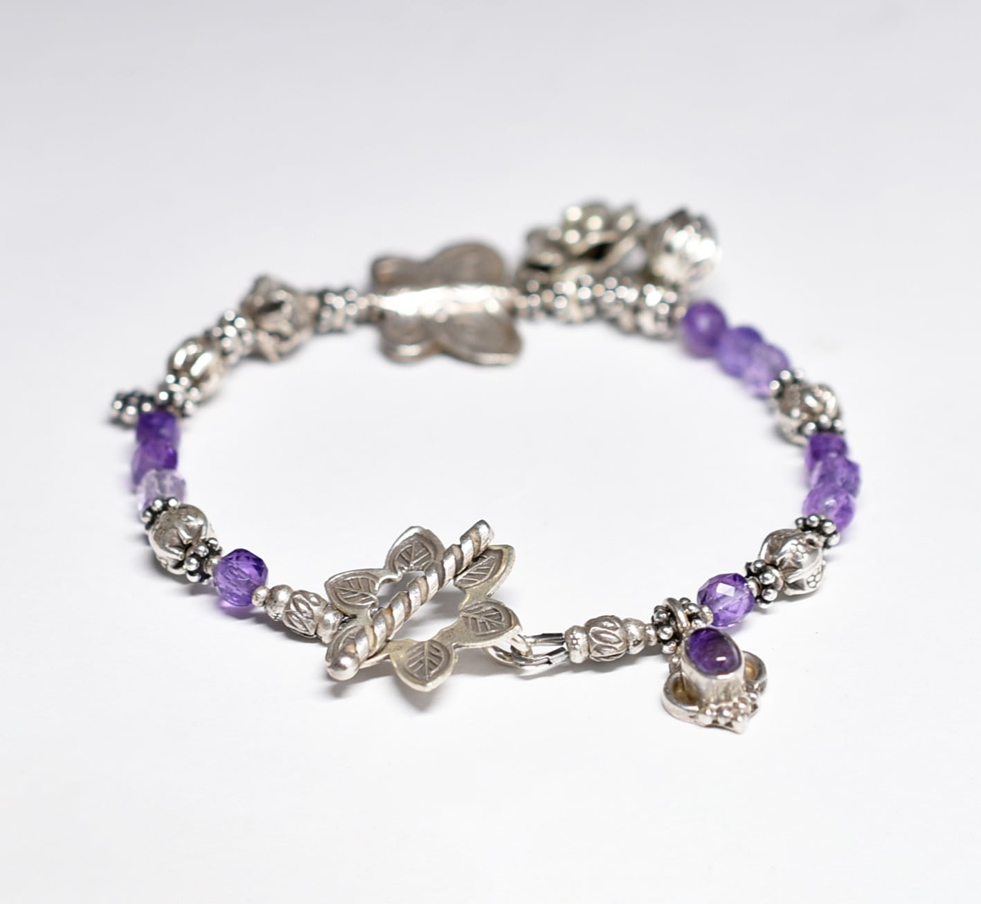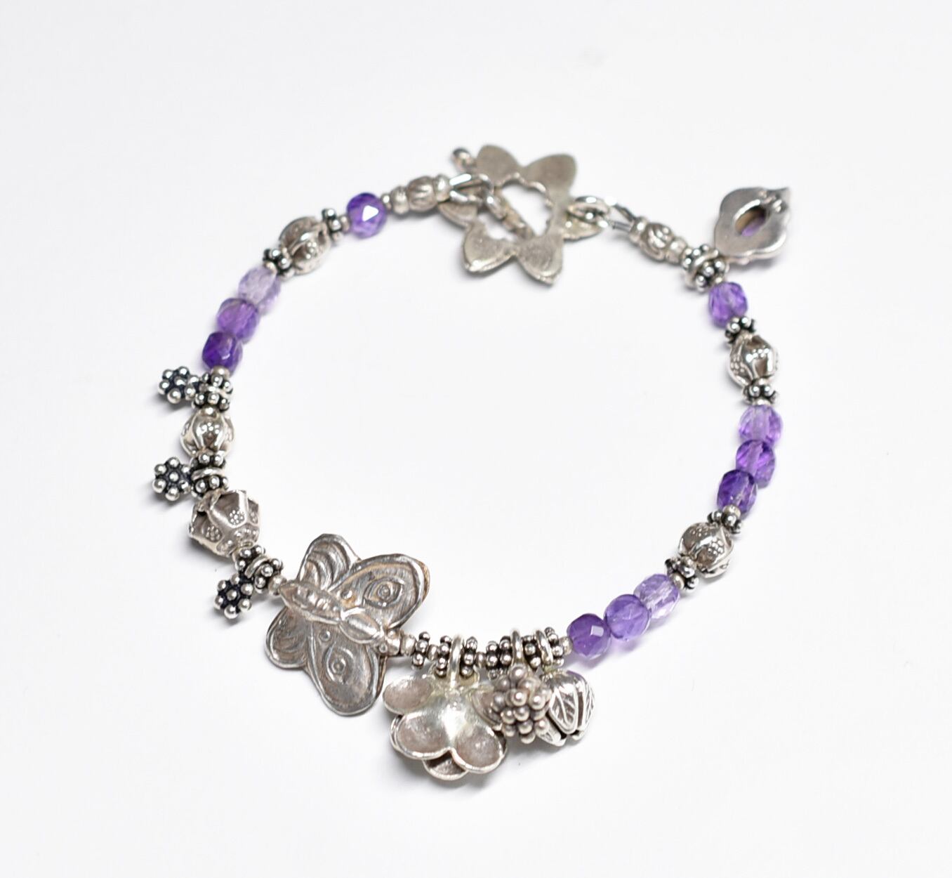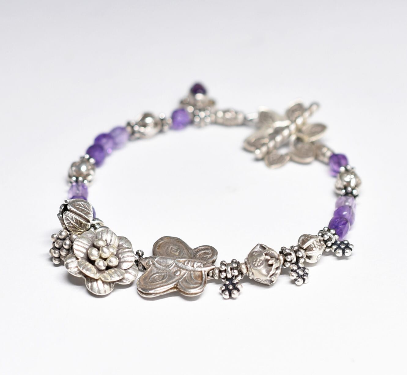 蝶&お花、多彩カレンシルバー、アメジスト、シルバー小花、シルバー装飾アメジストのブレス
