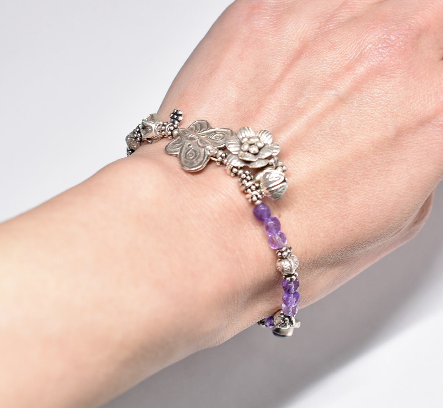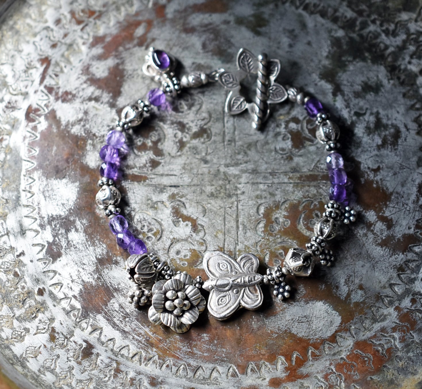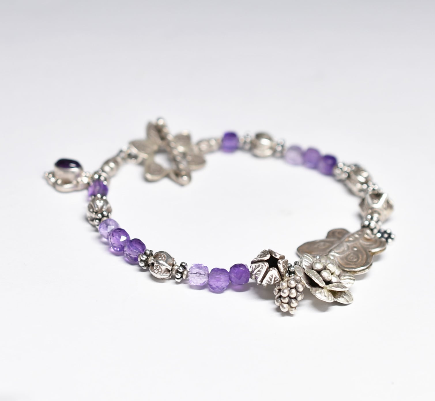 蝶&お花、多彩カレンシルバー、アメジスト、シルバー小花、シルバー装飾アメジストのブレス
