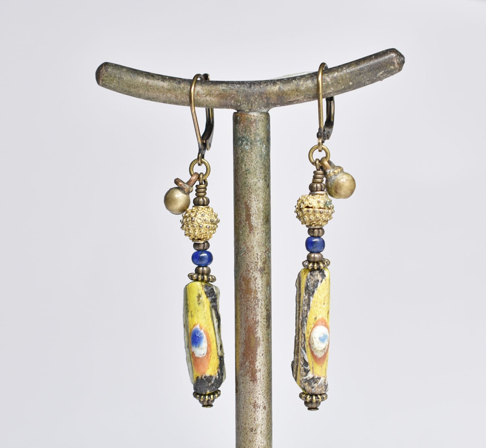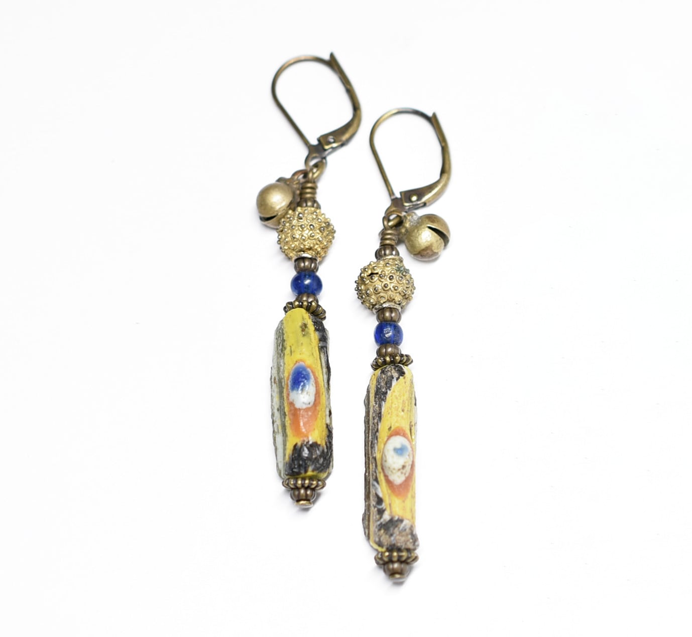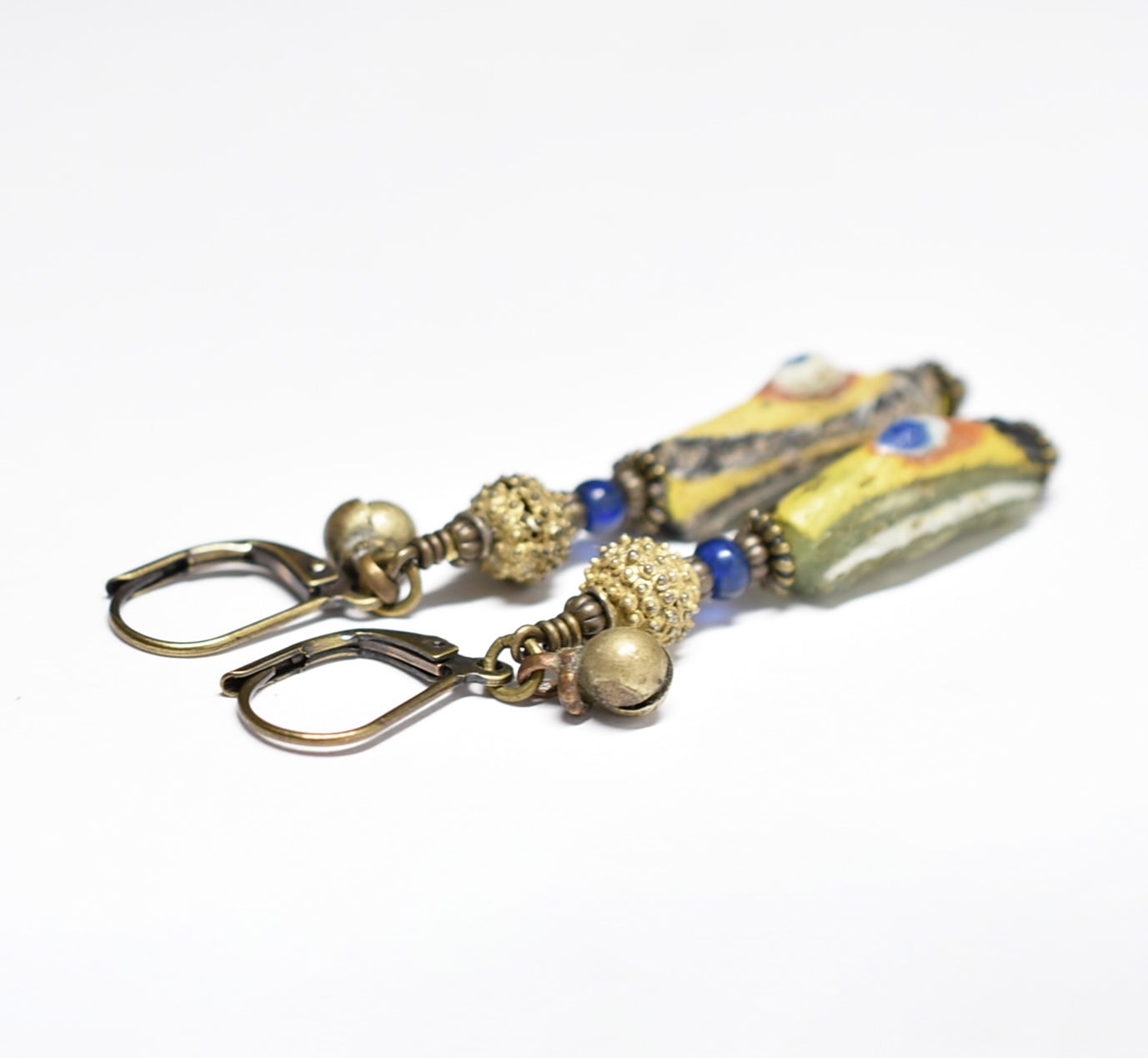 モザイク模様ローマングラスとイブルービーズ、つぶつぶブラス、民族鈴を繋いだピアスです。