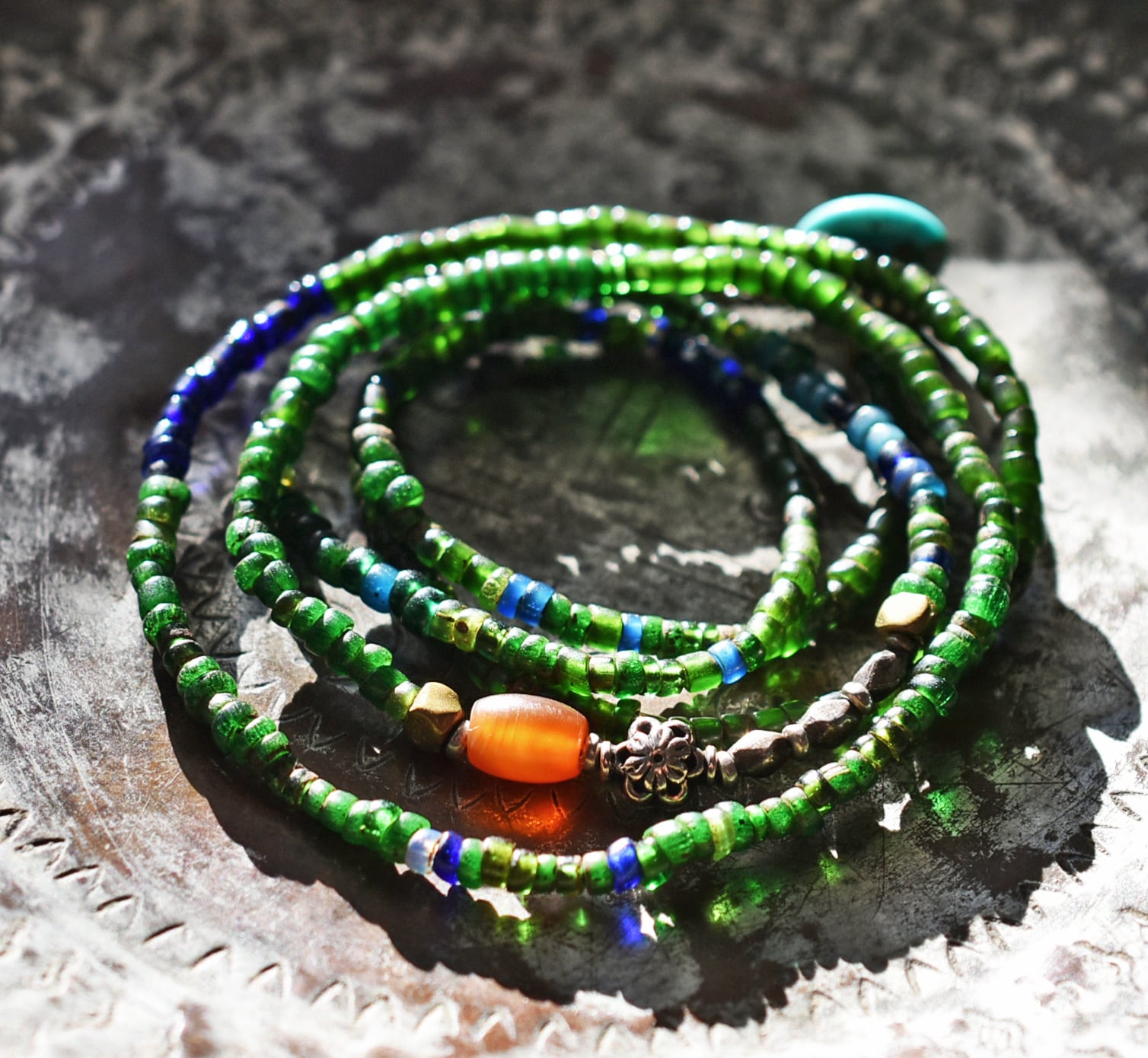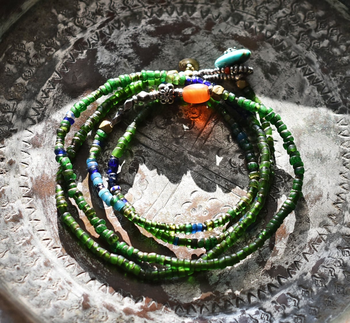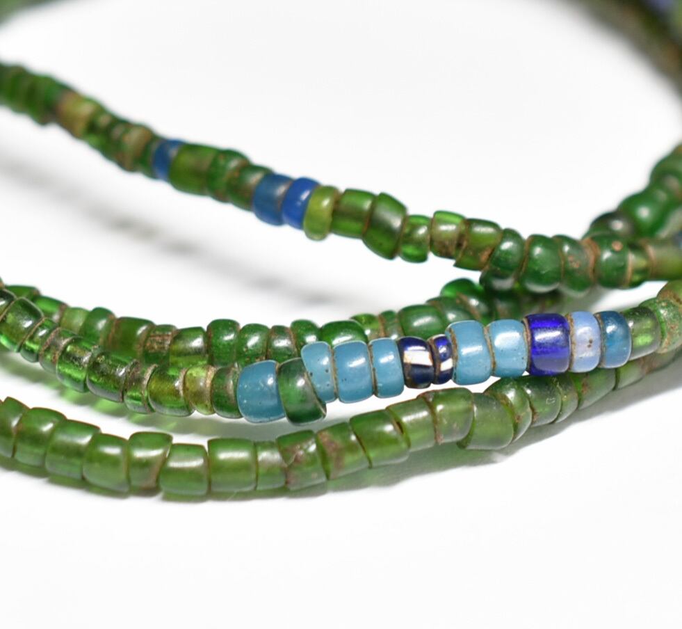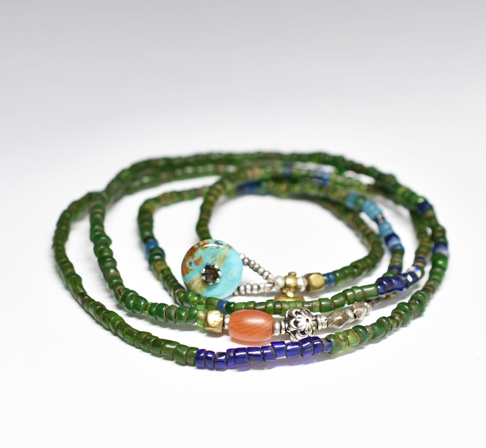 グリーンや、縞模様入りやブルーなどのビーズじゃインドのナガ族に渡った、古いヴェネチアビーズです。
