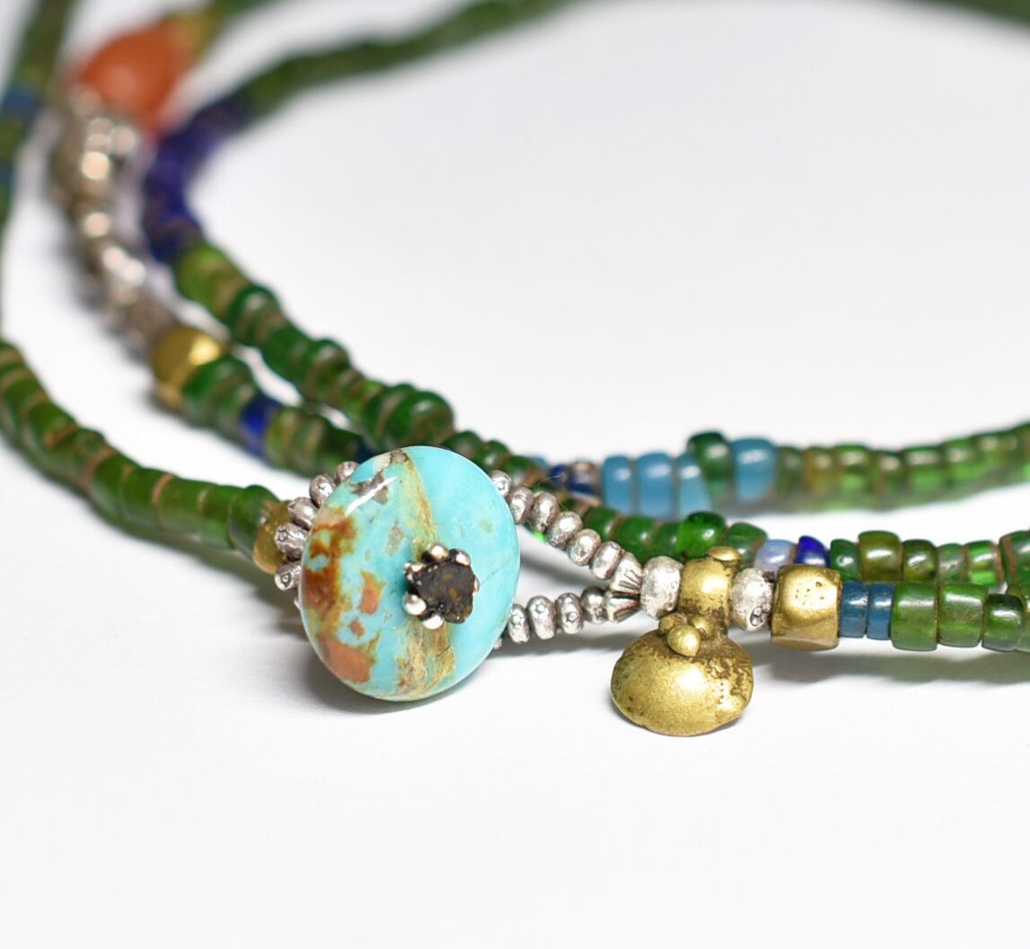 素材:ガラス、カレンシルバー、シャン族カーネリアン、oldチンシルバー、oldオリッサブラス、ターコイズ。ロウビキ紐