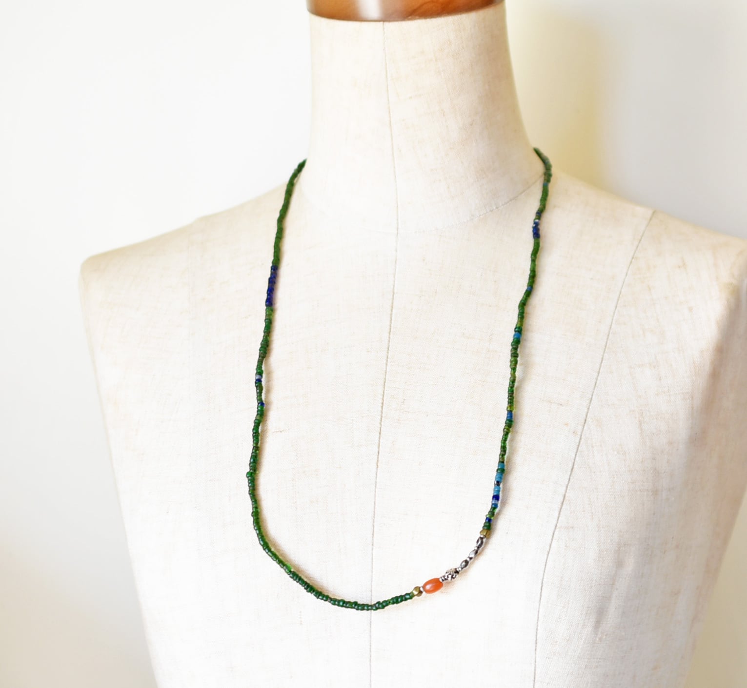 ナガ族アンティークビーズとシャン族カーネリアン&oldチンシルバーのロングネックレス(ターコイズ留め金)