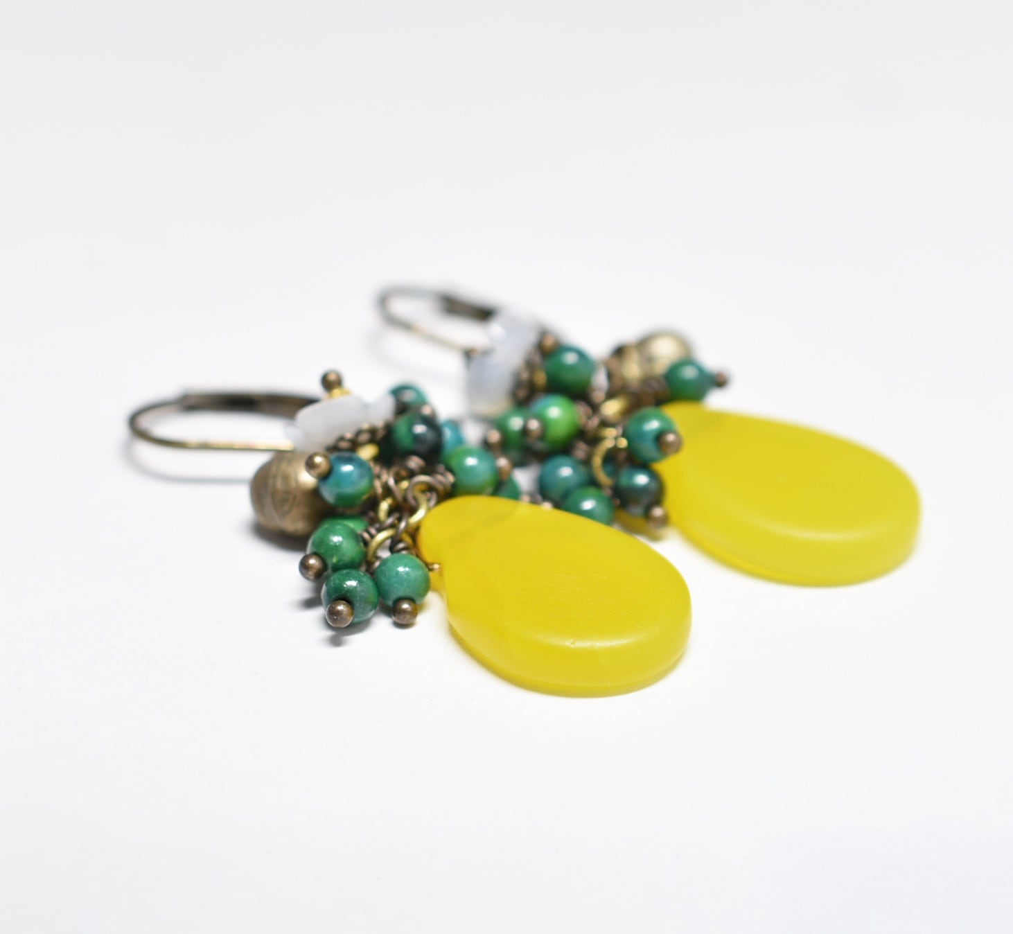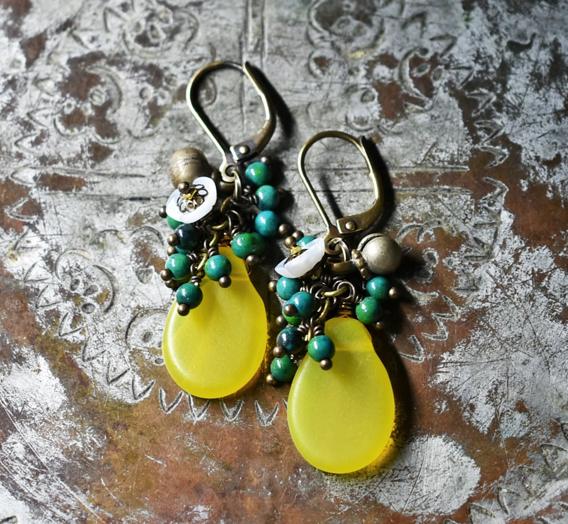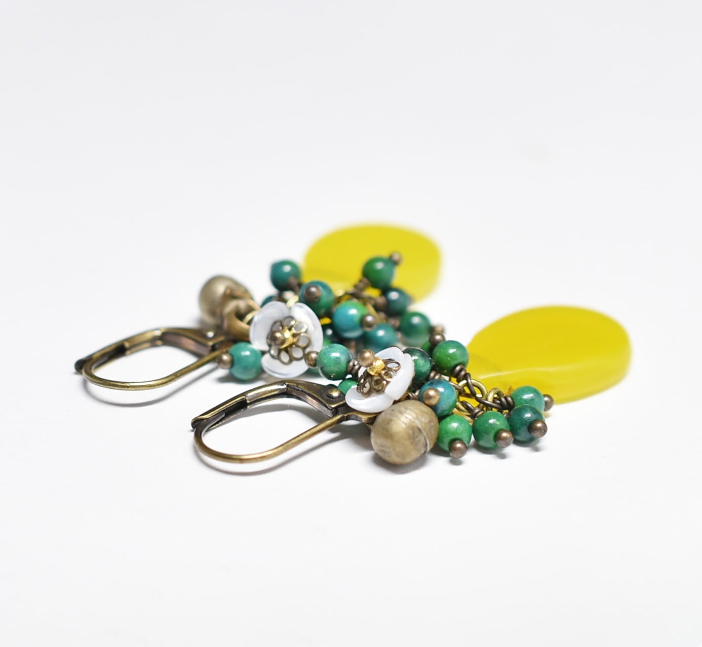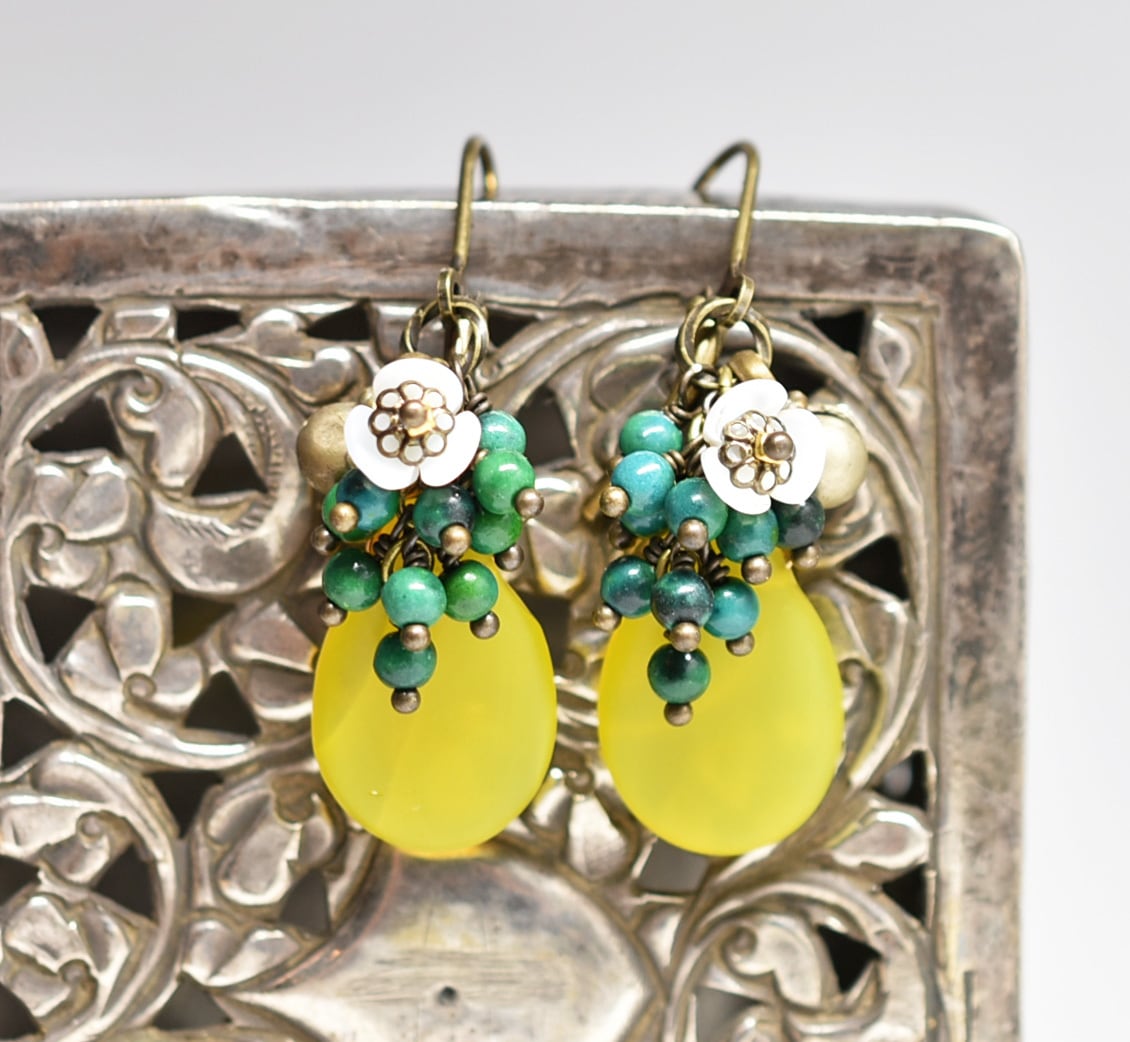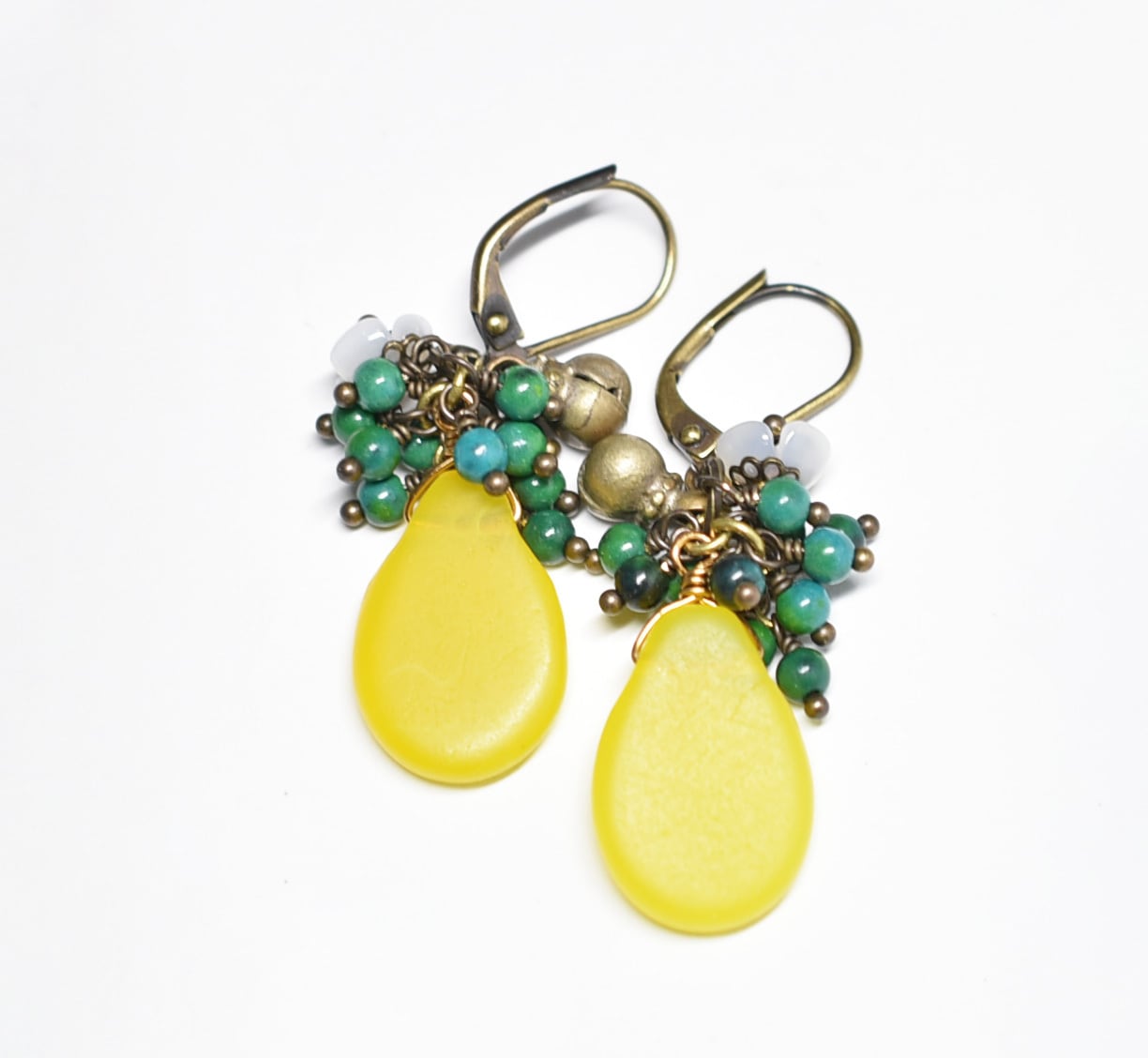 レモンイエローウエディングビーズとたわわなクリソコラ、白蝶貝の小花、民族鈴を繋いだピアスです。