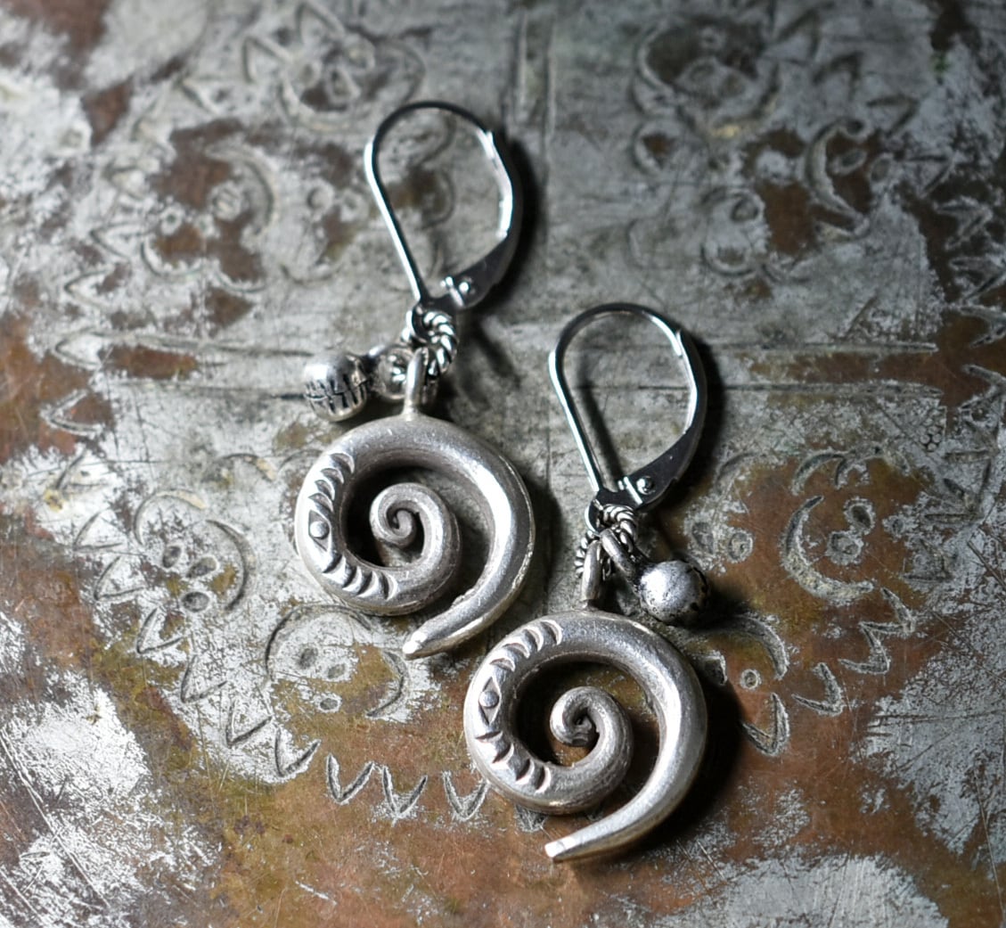 アイ模様刻印入り渦巻きカレンシルバーとインドシルバー鈴を繋いだピアスです