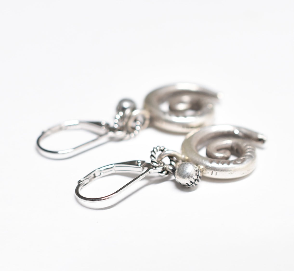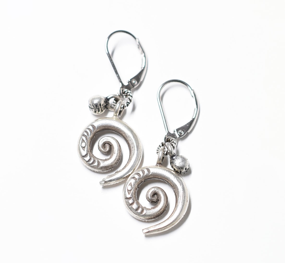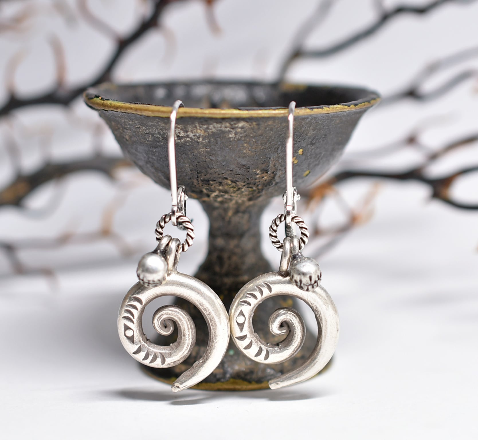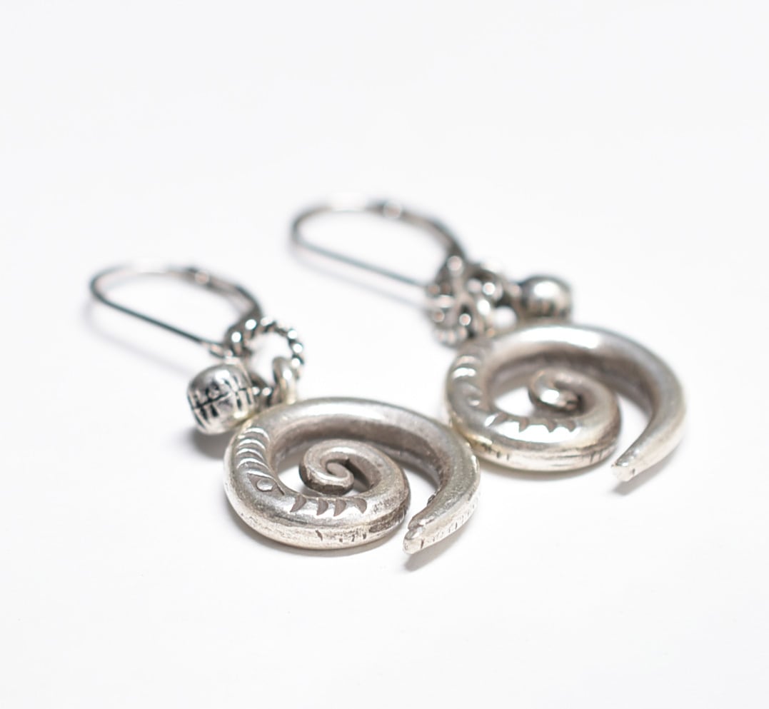 アイ模様刻印入り渦巻きカレンシルバーとインドシルバー鈴のピアス