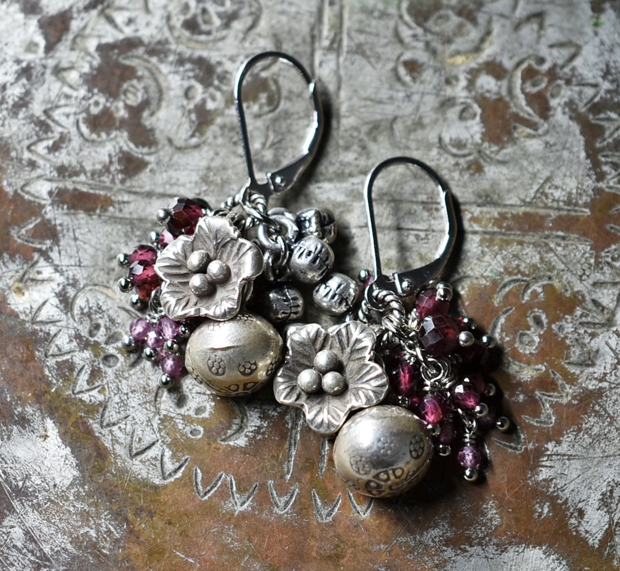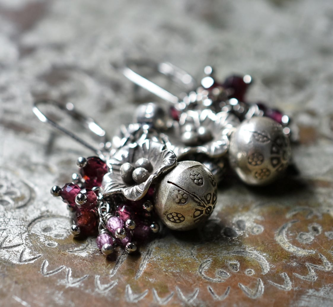 鈴とお花カレンシルバー、たわわなガーネット、インドシルバー鈴を繋いだピアスです。