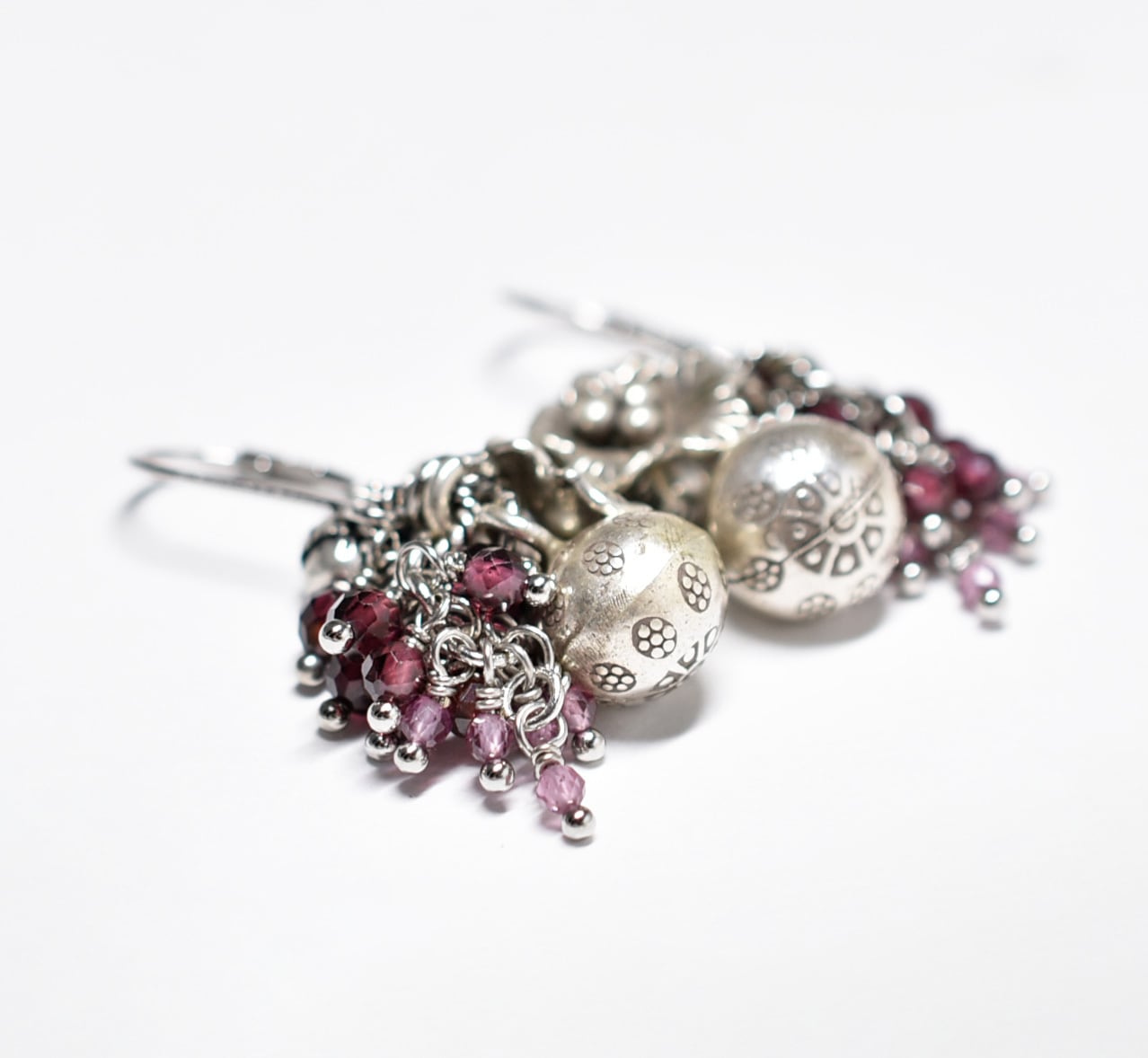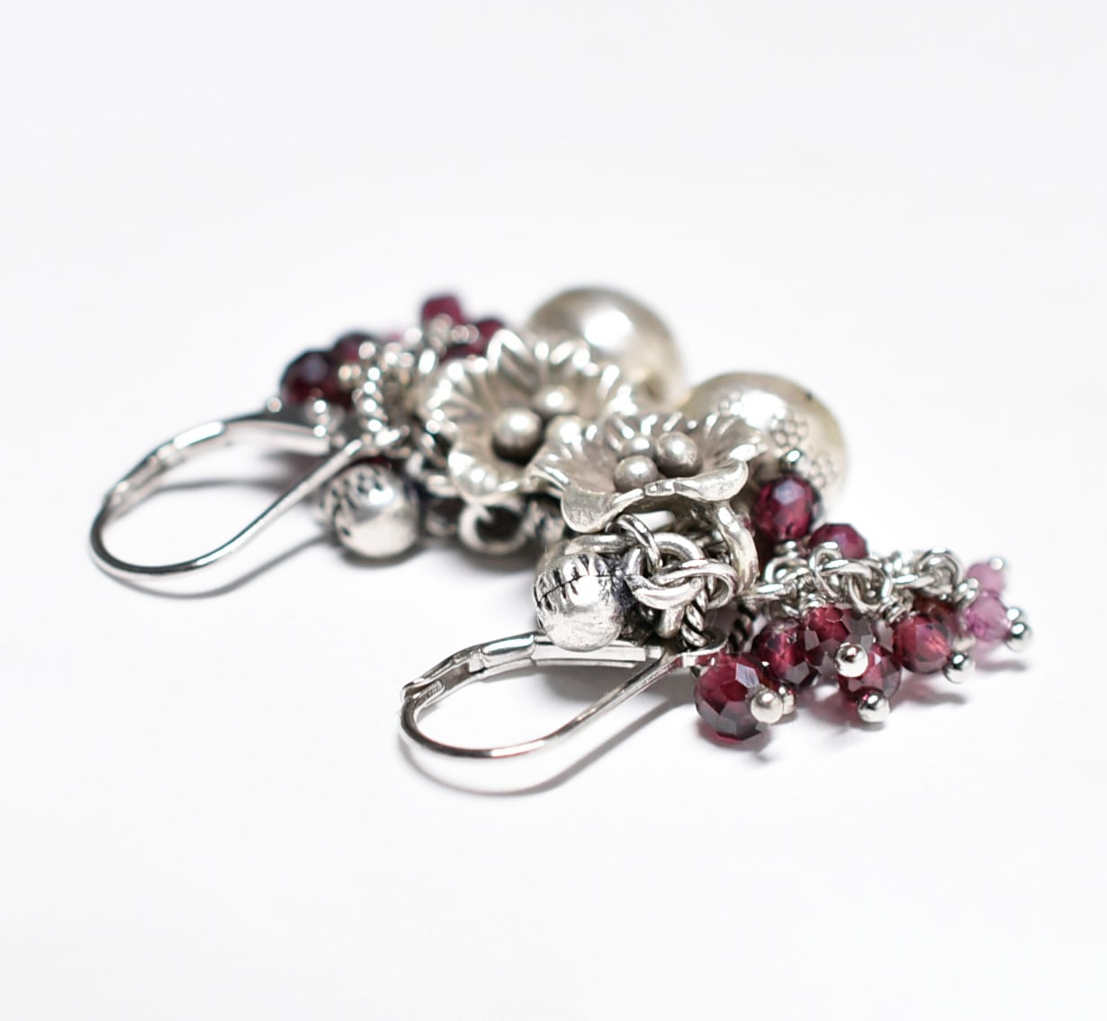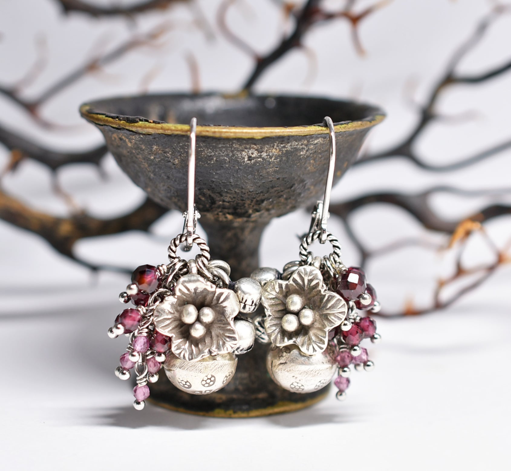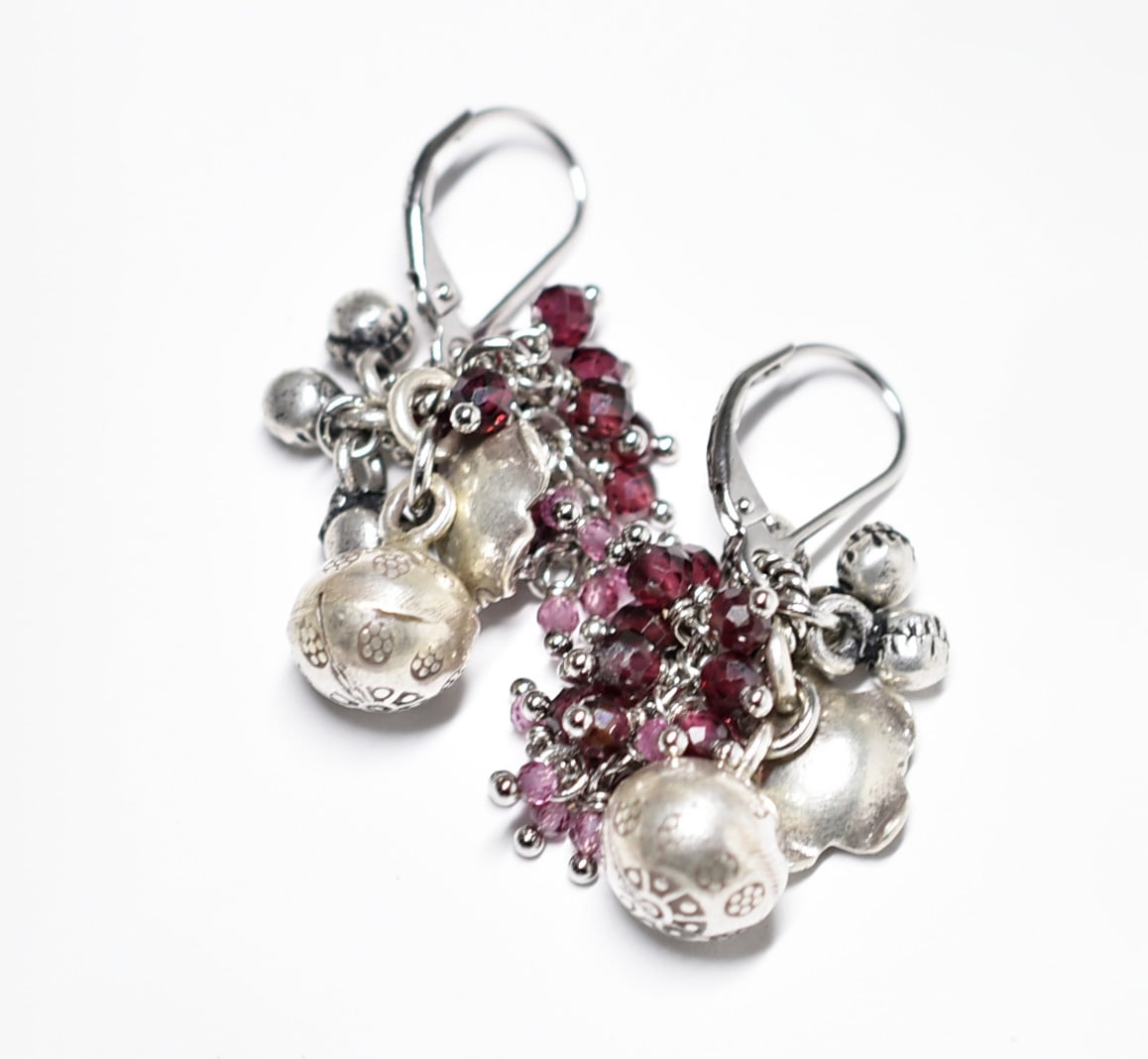 鈴とお花カレンシルバー、たわわなガーネット、インドシルバー鈴のピアス