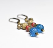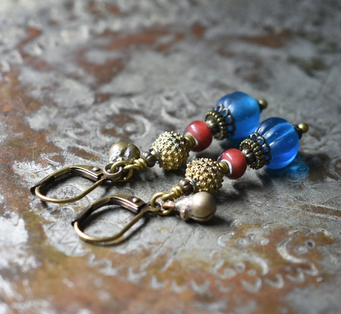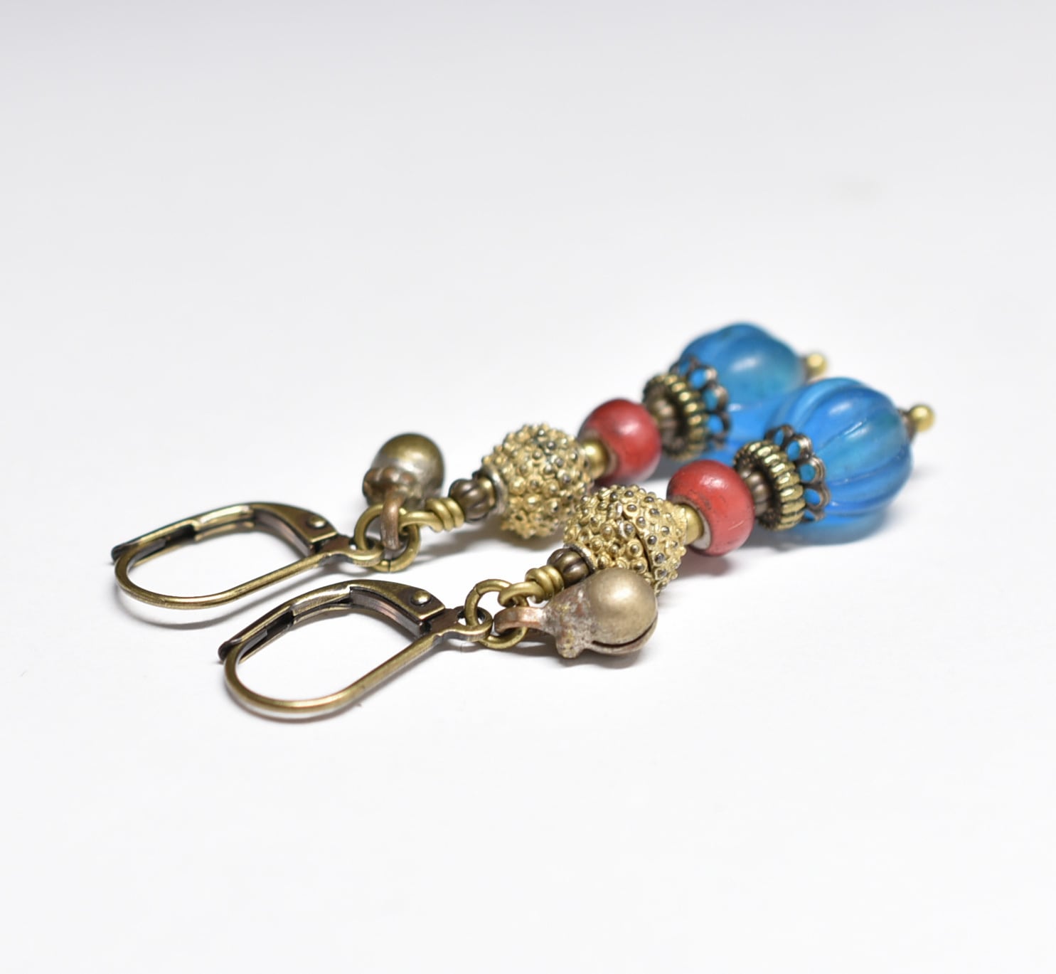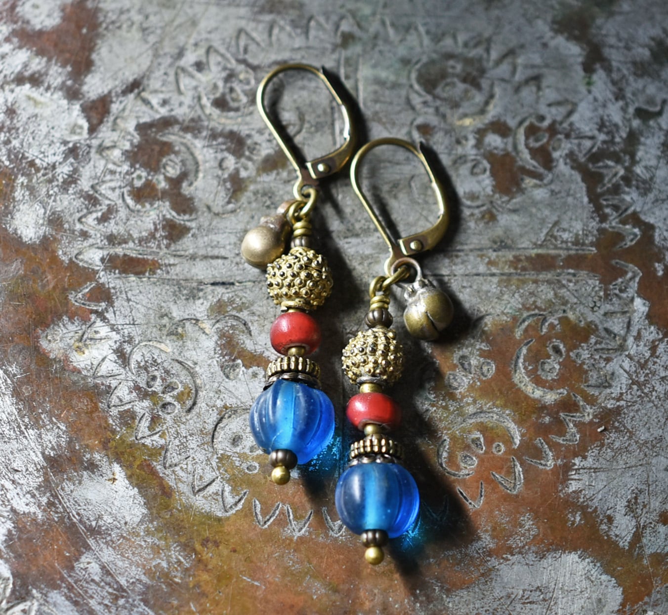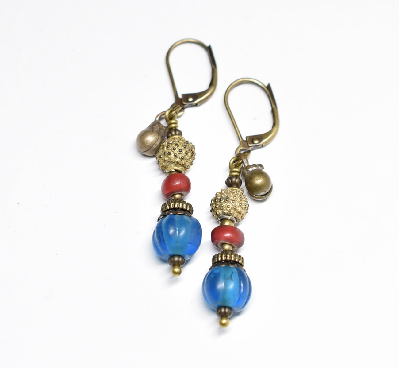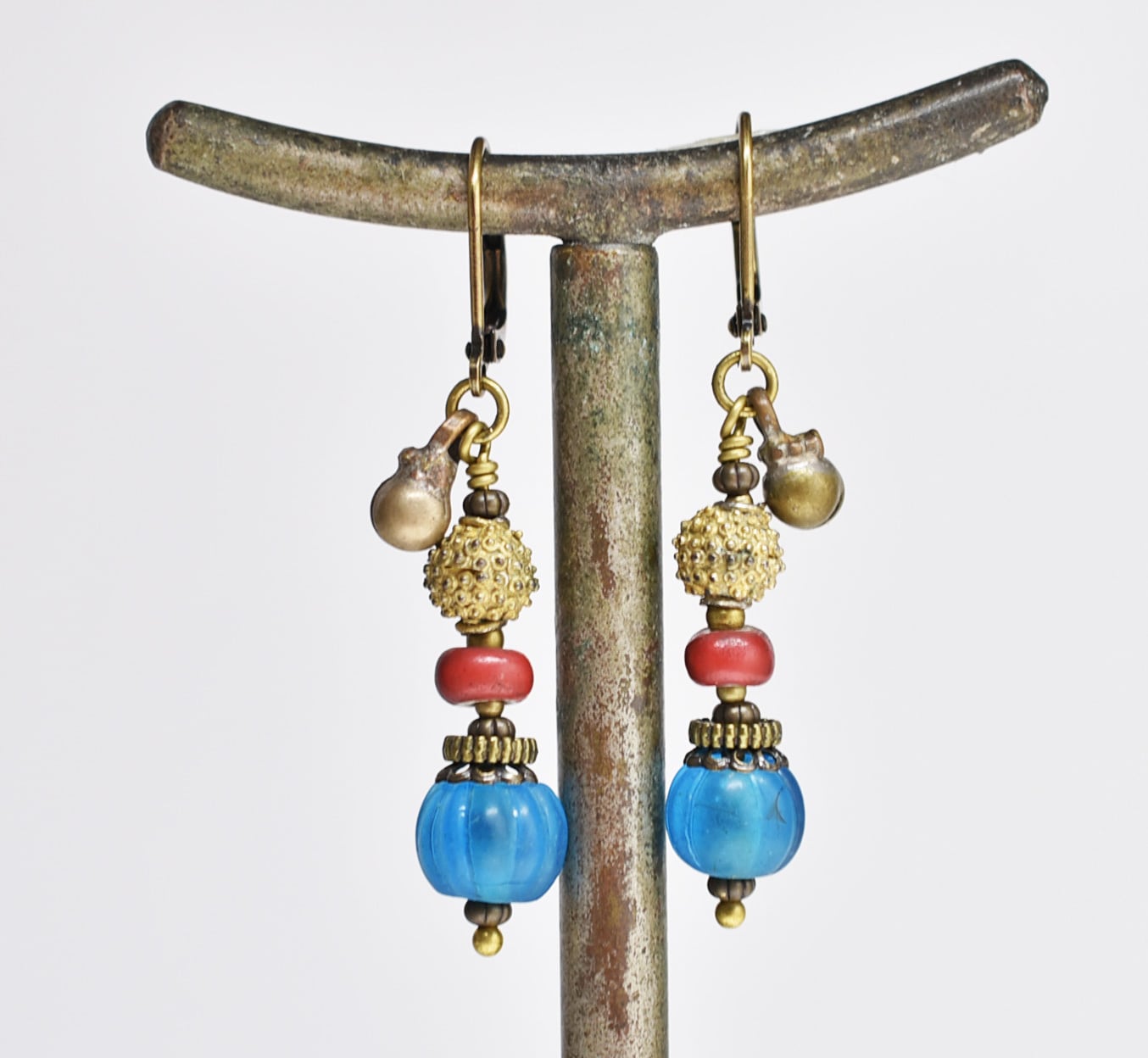 ナガ族スカイブルー蜜柑玉と金赤ホワイトハーツ、つぶつぶブラス、民族鈴を繋いだ小さなピアスです。