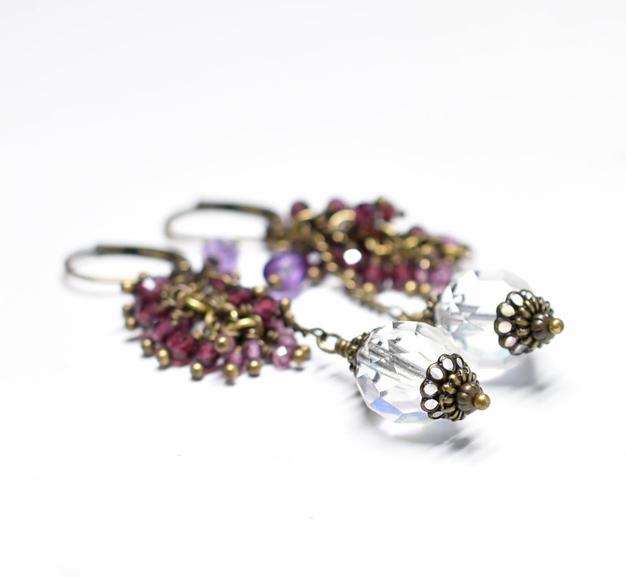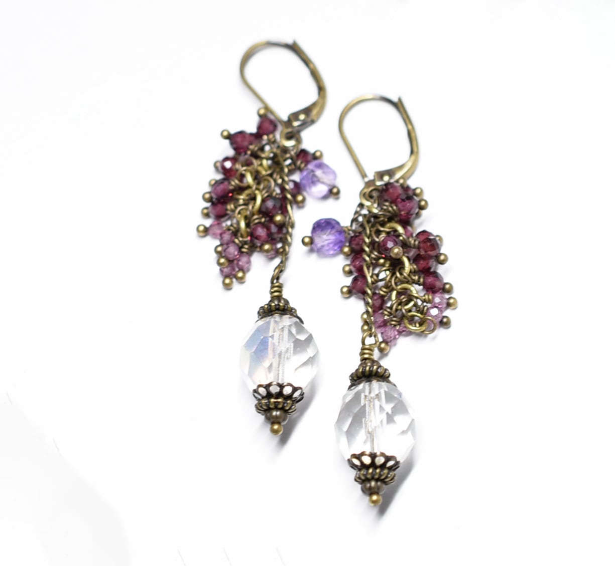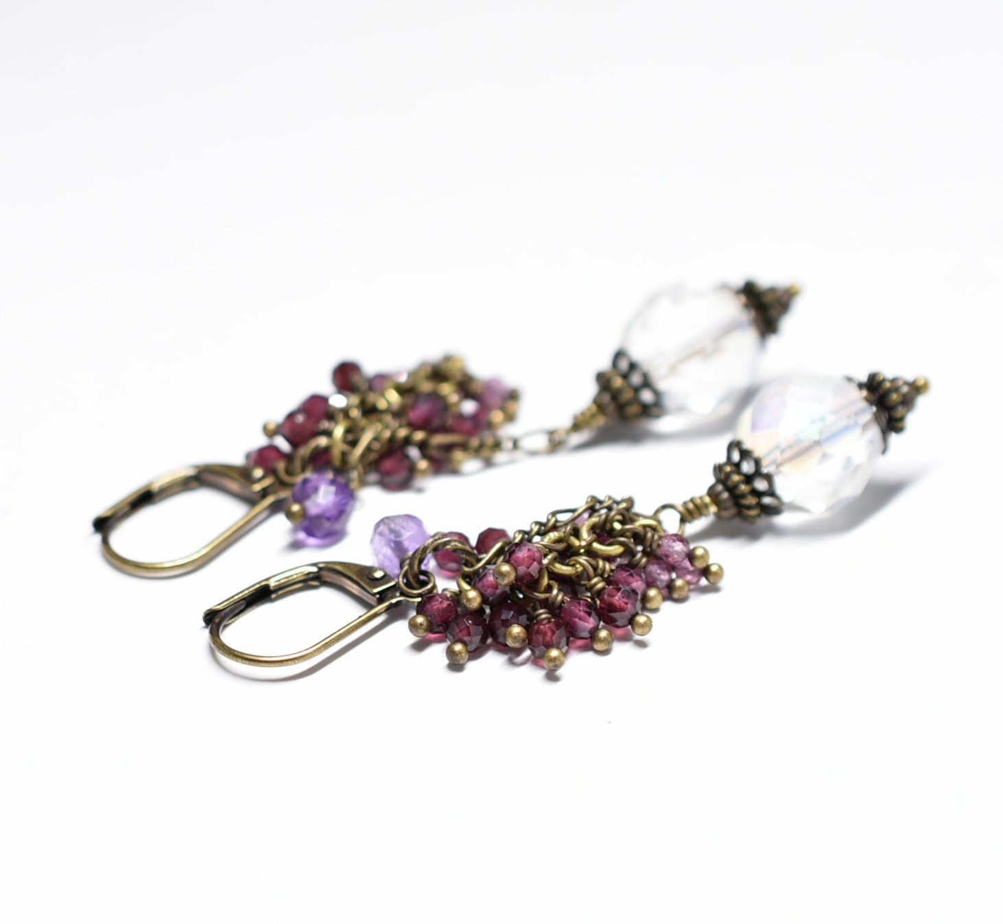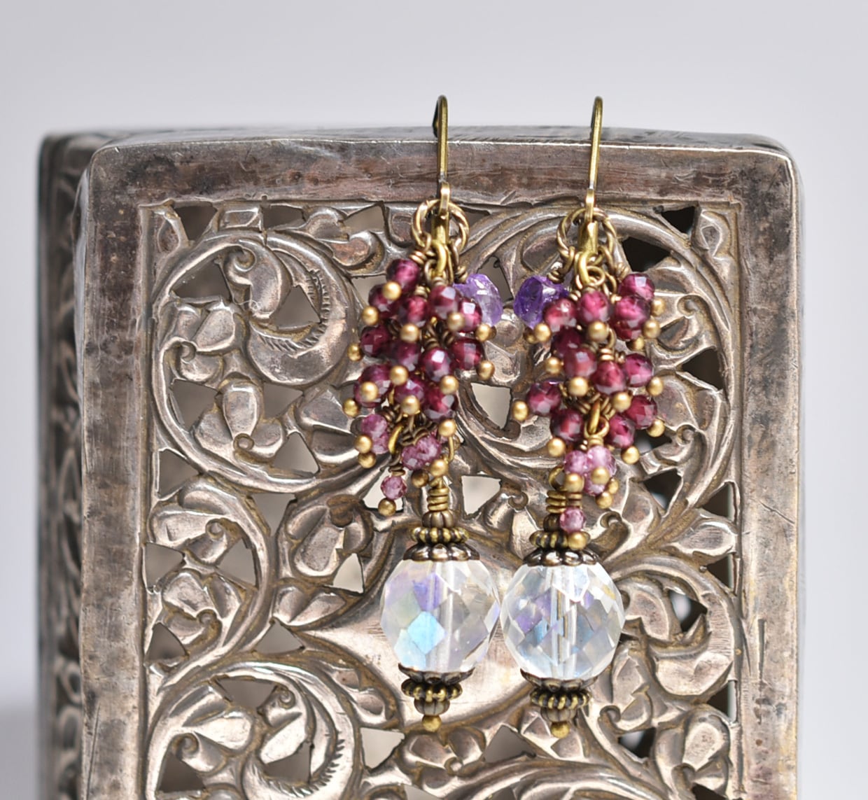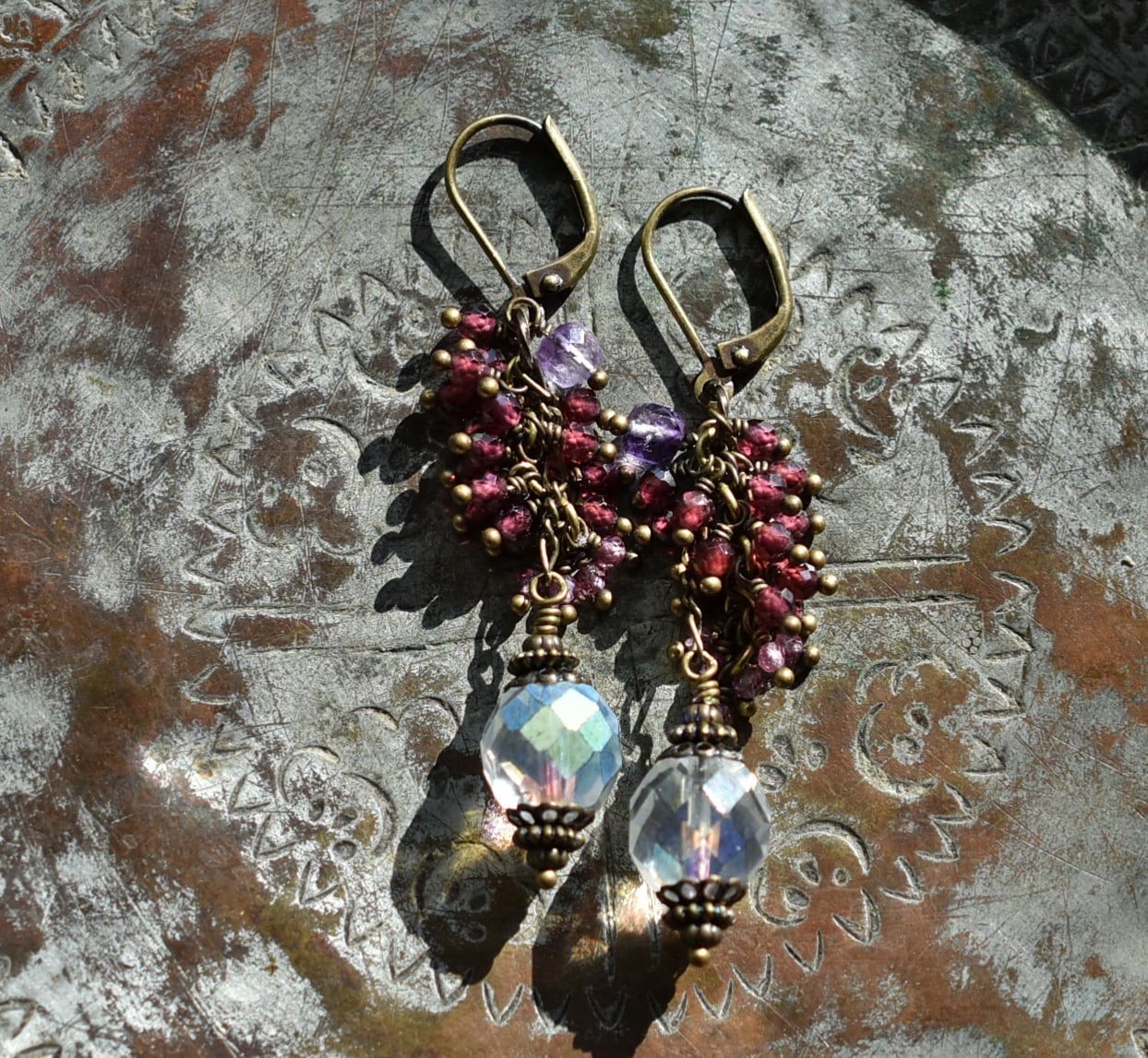 ヴィンテージオーロラチェコビーズとたわわなガーネット、アメジストのピアス