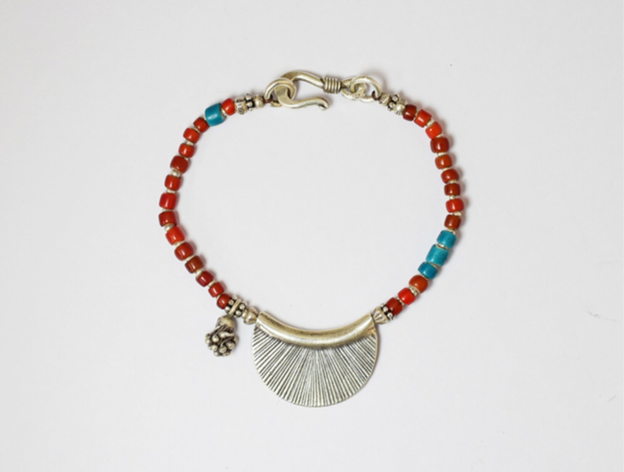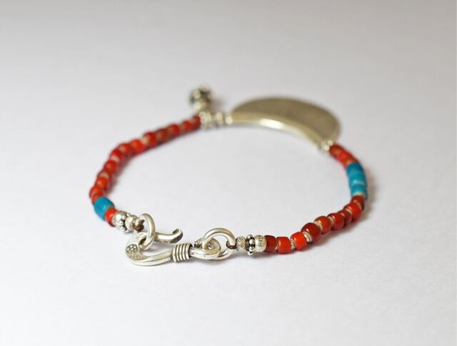 飴色や濃い赤色のアンティークホワイトハーツ(19〜20世紀)のビーズで、扇型のようなカレンシルバーを繋いだブレスです。