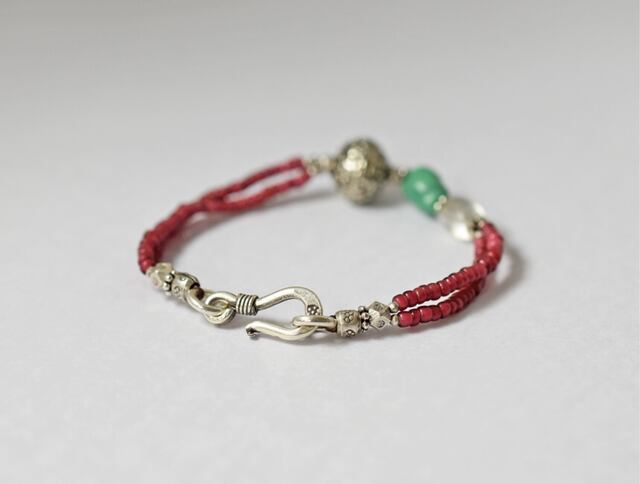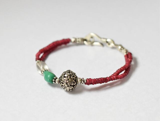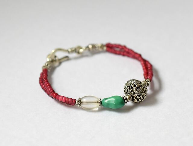 タイで見つけた繊細な装飾がされた丸いメタルビーズと、オールドチベタンターコイズ、アンティークのボヘミアビーズを、小さな金赤ホワイトハーツで繋いだ2連のブレスです。