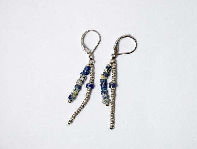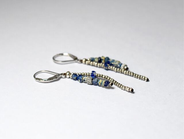 小さな小さなカレンシルバーと、インドパシフィックビーズ(7〜13世紀)を繋いだピアスです。