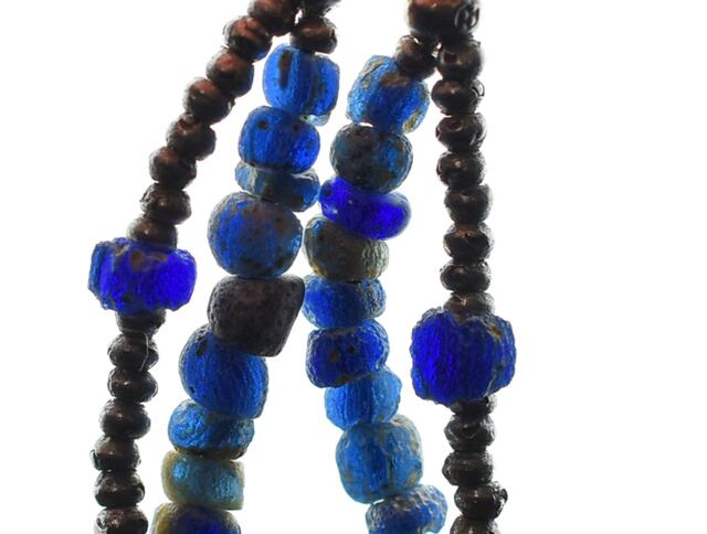 インドパシフィックビーズはもともと青色だったものが、地中に埋まっていたために、付着物がつき、さらに銀化もした、退廃的な雰囲気になっています。