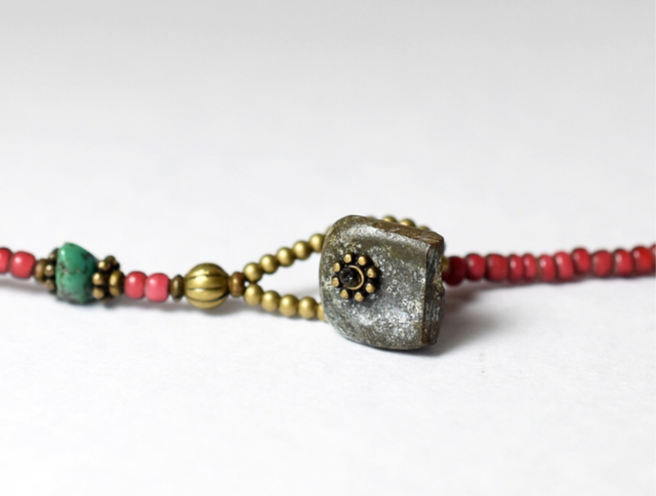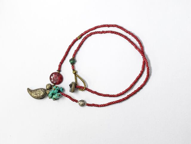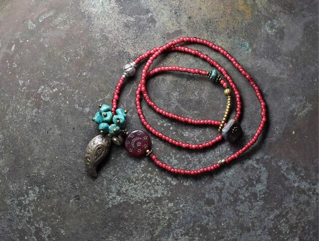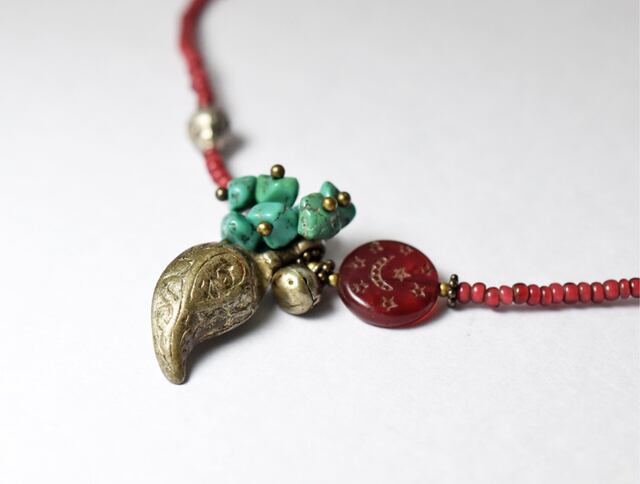 不揃いなターコイズをたわわにつけて、アフガニスタンのペイズリーのような古いメタルパーツと、聖者のビーズと呼ばれるアンティークのボヘミアビーズ、小さな鈴を一粒つけました。