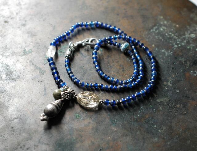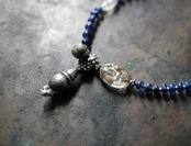 群青色アンティークビーズとロザリオパーツ、oldシルバーのネックレス