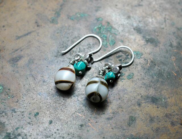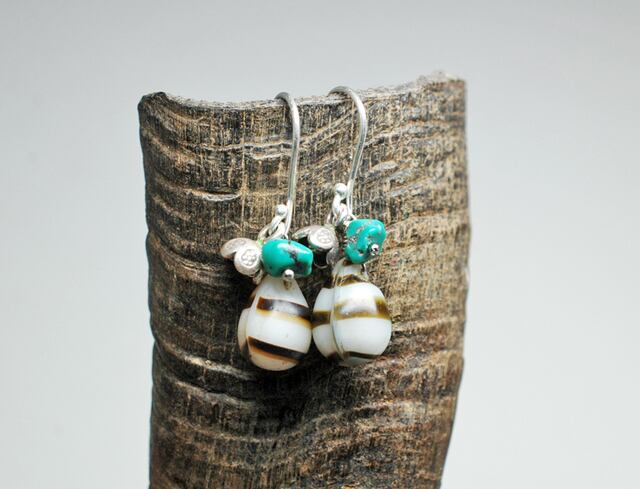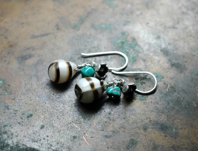 シマシマ模様が可愛らしいアンティークのボヘミアビーズに、一粒のターコイズと、カレンシルバーの小さなお花のチャームが揺れるピアスです。