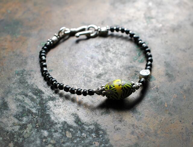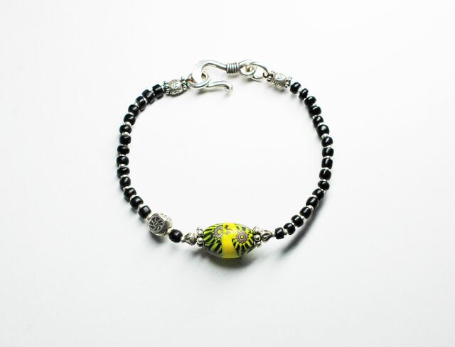 ミルフィオリ(千の華)と呼ばれているラグビーボール型のビーズを、不揃いなブラック色のビーズで繋いだブレスです。