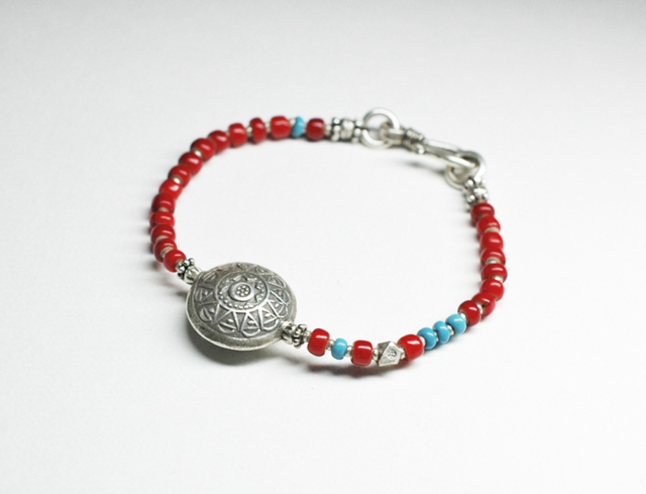 ロウ引き紐で繋いでいますので、身につけているうちにしなやかなつけ心地になります。