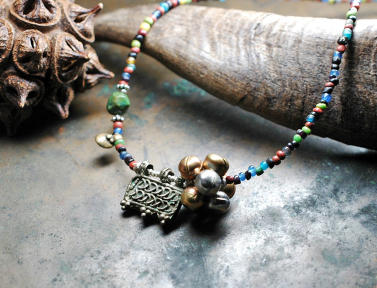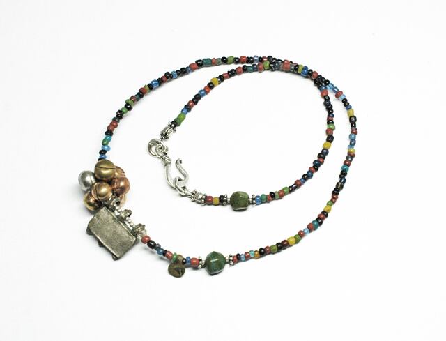 エチオピアンシルバーと多彩アンティークビーズの鈴なりネックレス