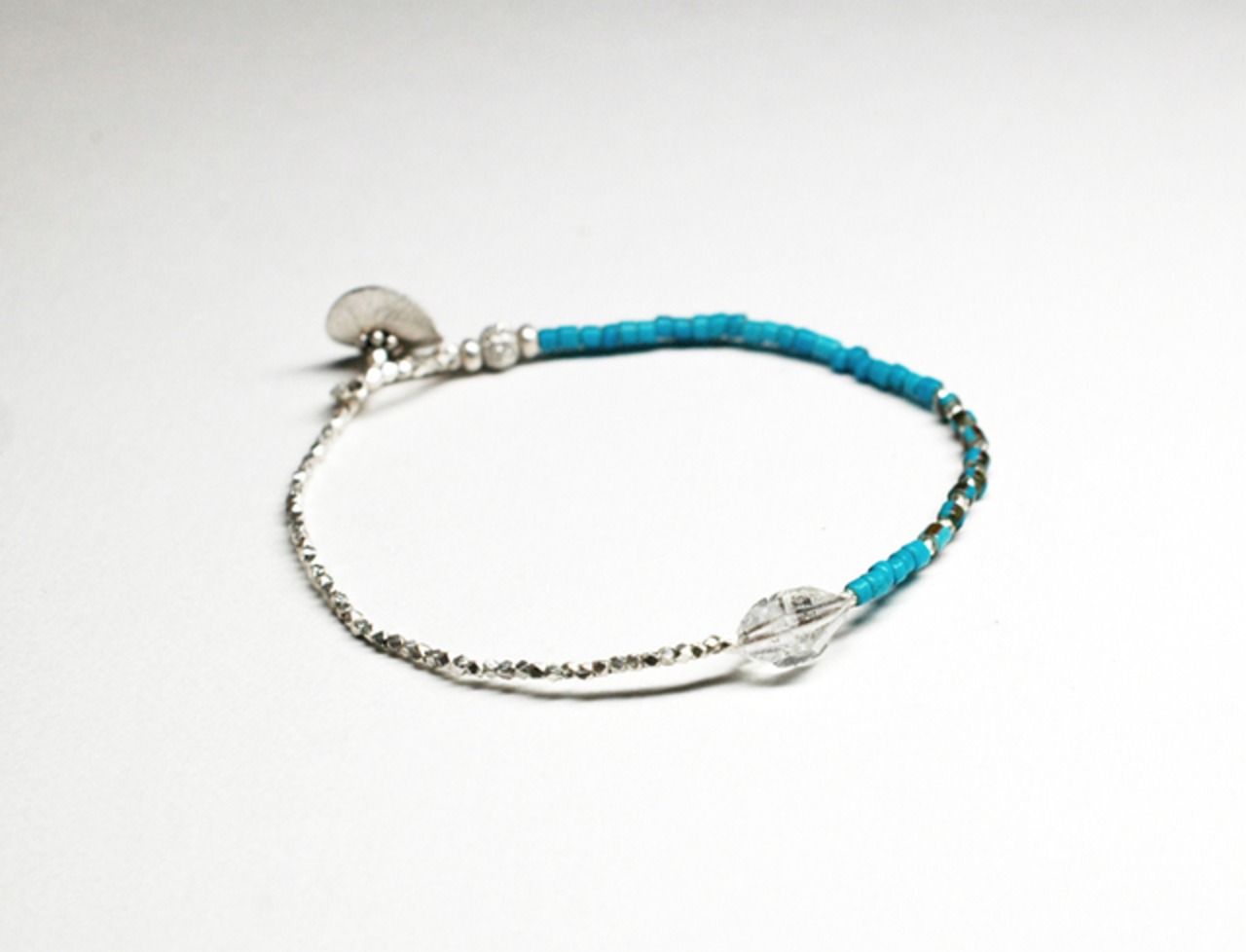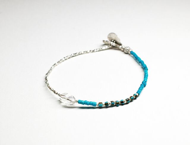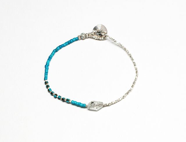ハーキマーダイヤモンドを、ターコイズブルーのアンティークビーズと小さなカレンシルバーで繋いだブレスです。