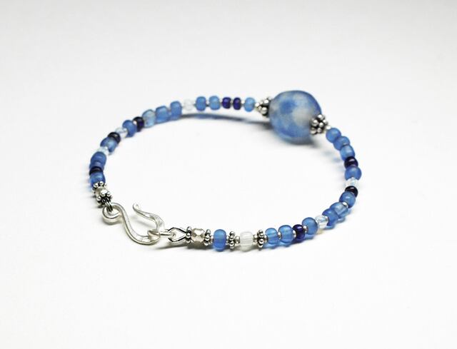 爽やかなスカイブルーや、濃い瑠璃糸、オパールガラスがミックスされています。