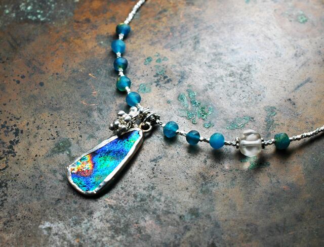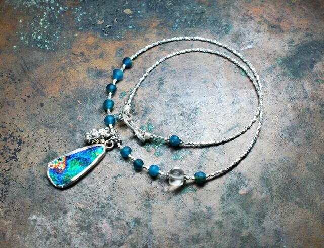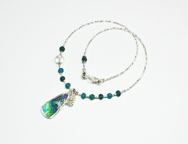 虹色銀化ローマングラスと雨粒グラス煌めくカレンシルバーのネックレス