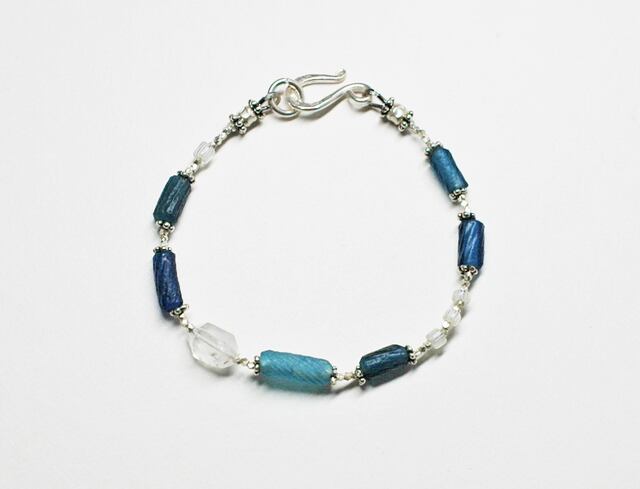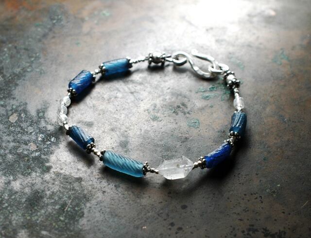 ブルーのローマングラスと、一粒のハーキマーダイヤモンド、小さなグーズベリーをカレンシルバーで繋いだブレスです。