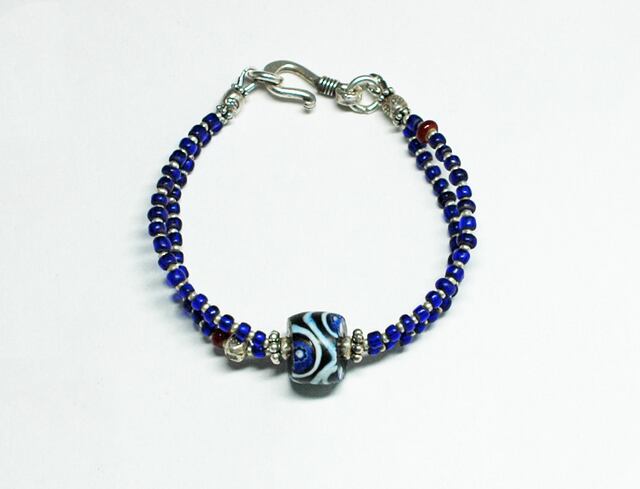ミルフィオリ(千の華)と呼ばれるアンティークのベネチアビーズ(19~20世紀)を、こちらもアンティークの瑠璃色ビーズで繋いだブレスです。