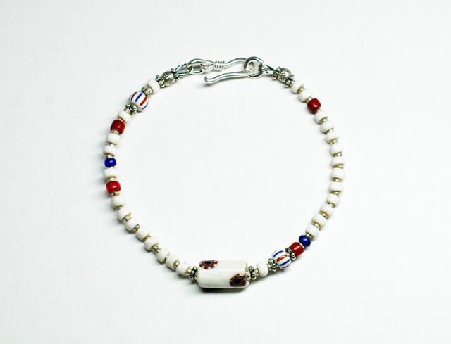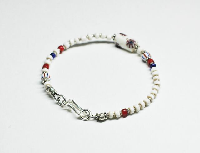 ミルフィオリ(千の華)と呼ばれるアンティークのベネチアビーズ(19~20世紀)を、白色を中心としたトリコロールカラーのアンティークビーズで繋いだブレスです。