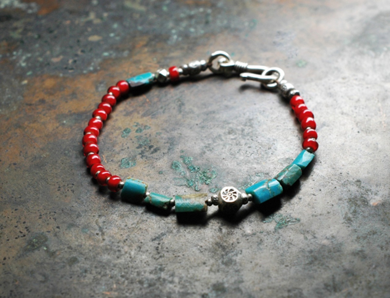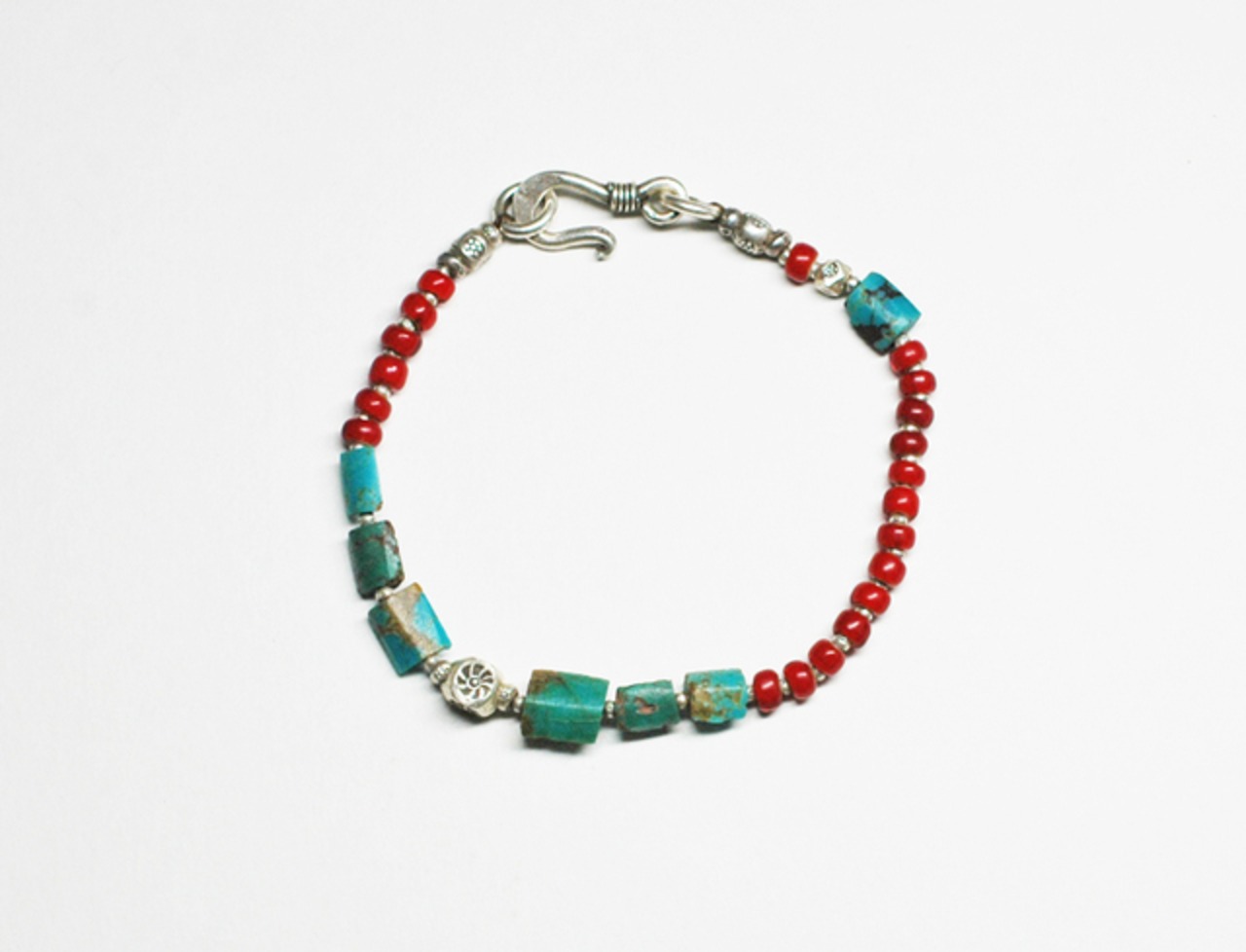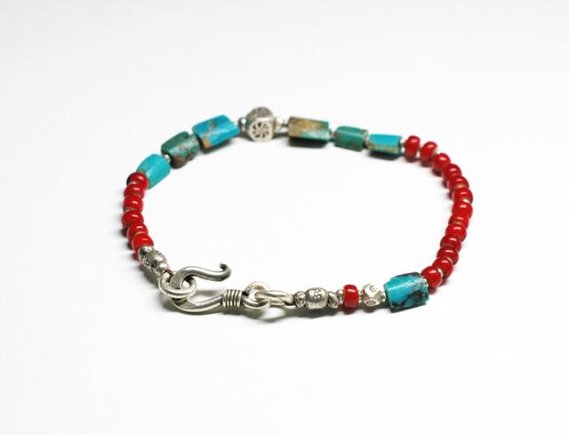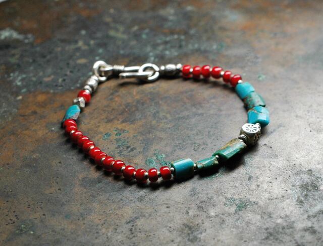 濃いめの四角いターコイズと、アンティークのホワイトハーツを繋いだブレスです。