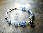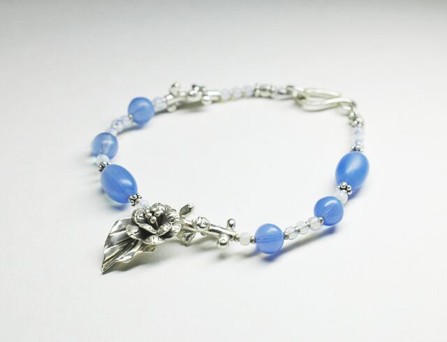 薄い青藤色ボヘミアビーズとお花と葉っぱ枝のブレス