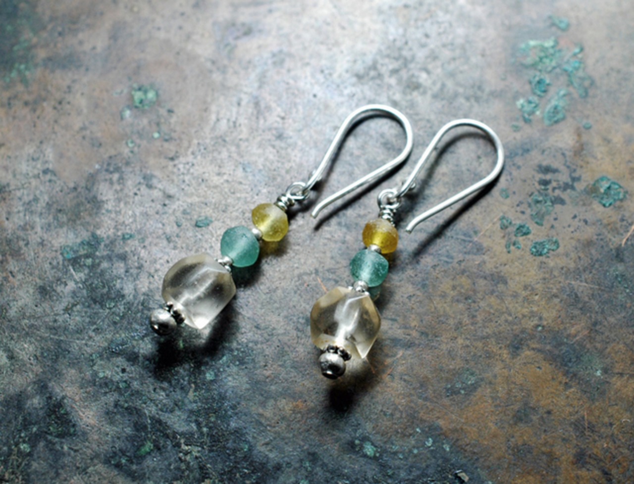 丸い2色のローマングラスと、透明なボヘミアビーズを繋いだピアスです。