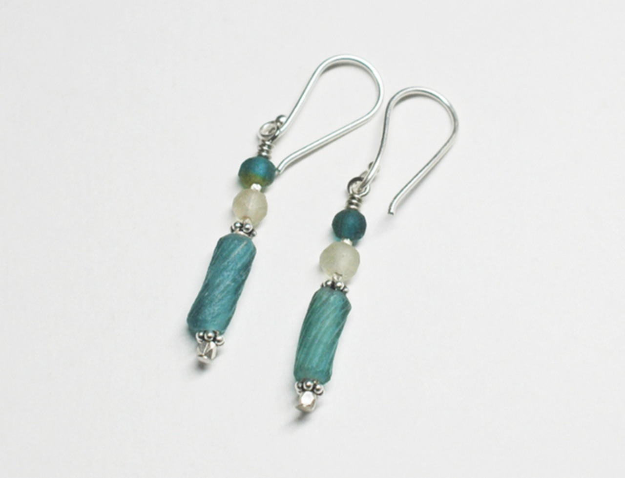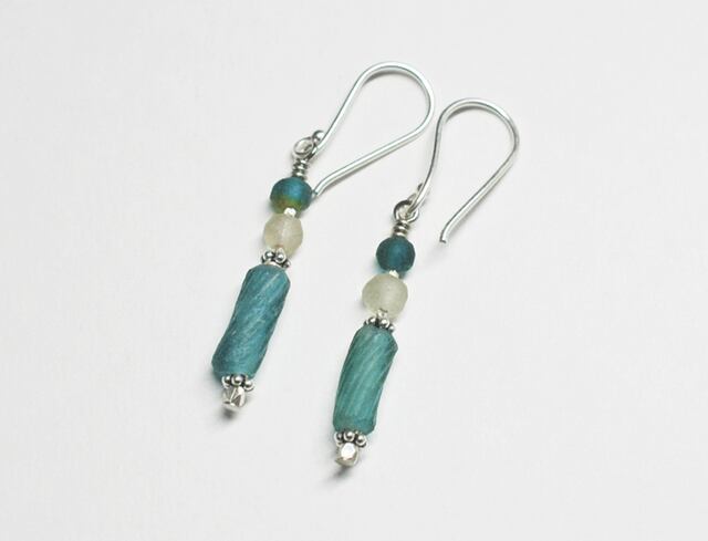 細長いチューブ型、丸型のローマングラスを繋いだピアスです。