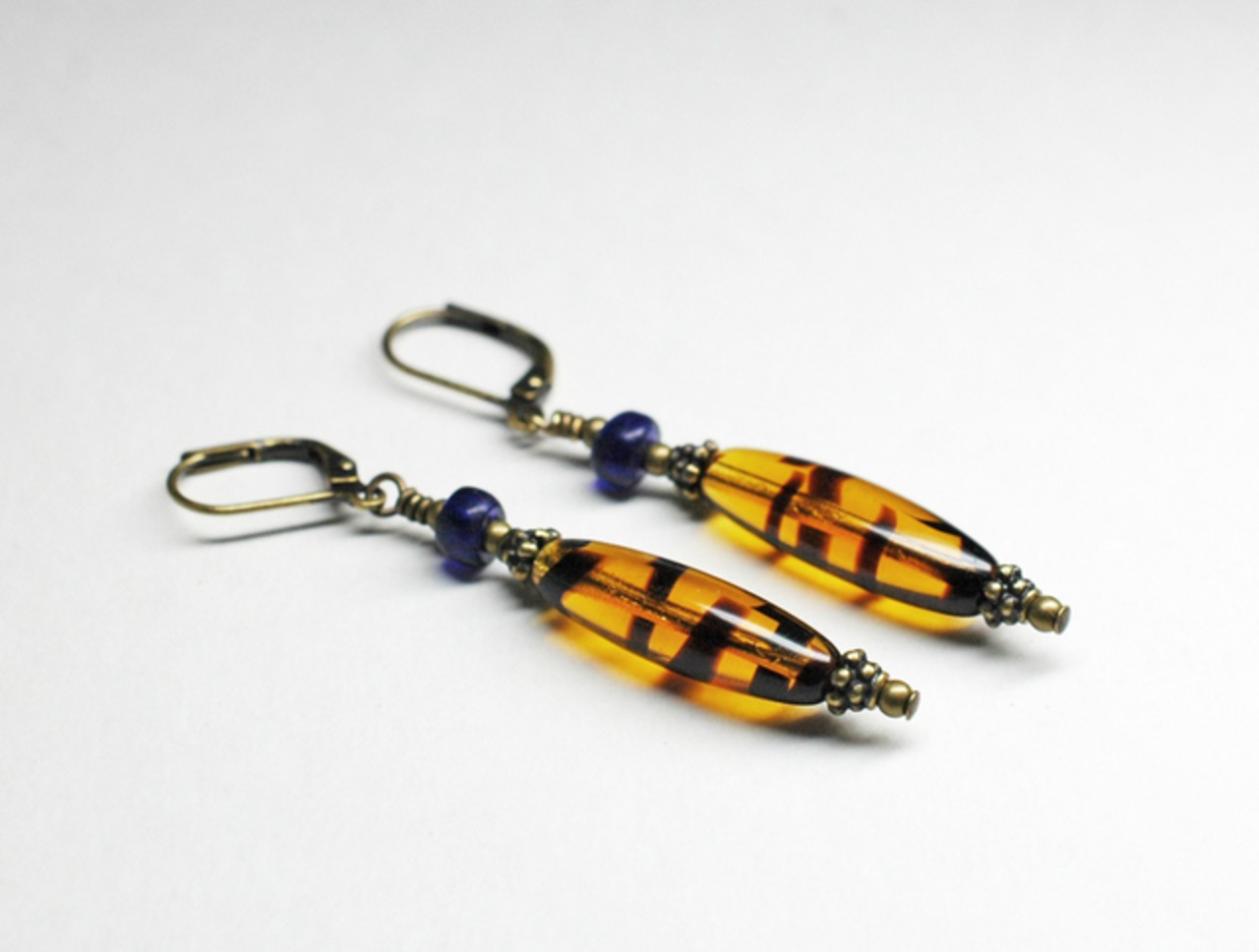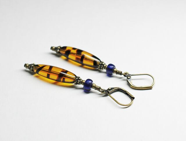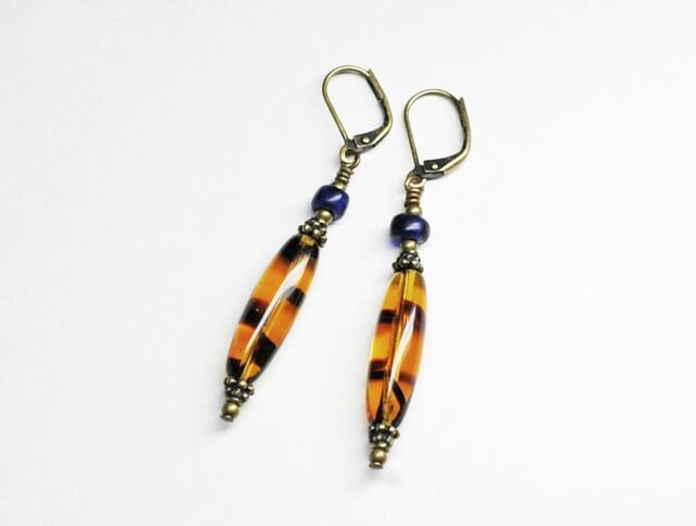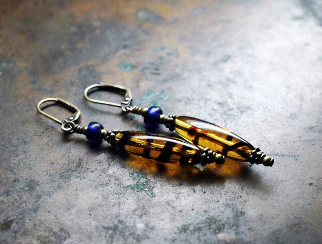 べっ甲色の細長いビーズに深いブルーのビーズを合わせました。ブルーのビーズはアンティークのベネチアビーズです。