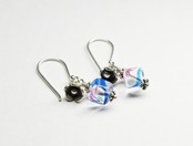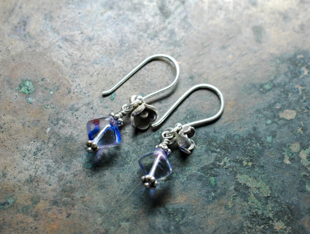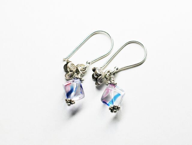 アイリスガラスと呼ばれるチェコ産のヴィンテージビーズにお花を添えたピアスです。