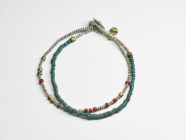 青碧色の小さなシードビーズと、小さなカレンシルバーに血赤色のホワイトハーツ、oldオリッサブラスを合わせた2連のブレスです。