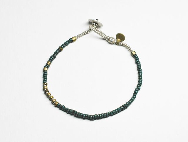 青碧色の小さなシードビーズと、oldオリッサブラス、小さなカレンシルバーを繋いだブレスです。