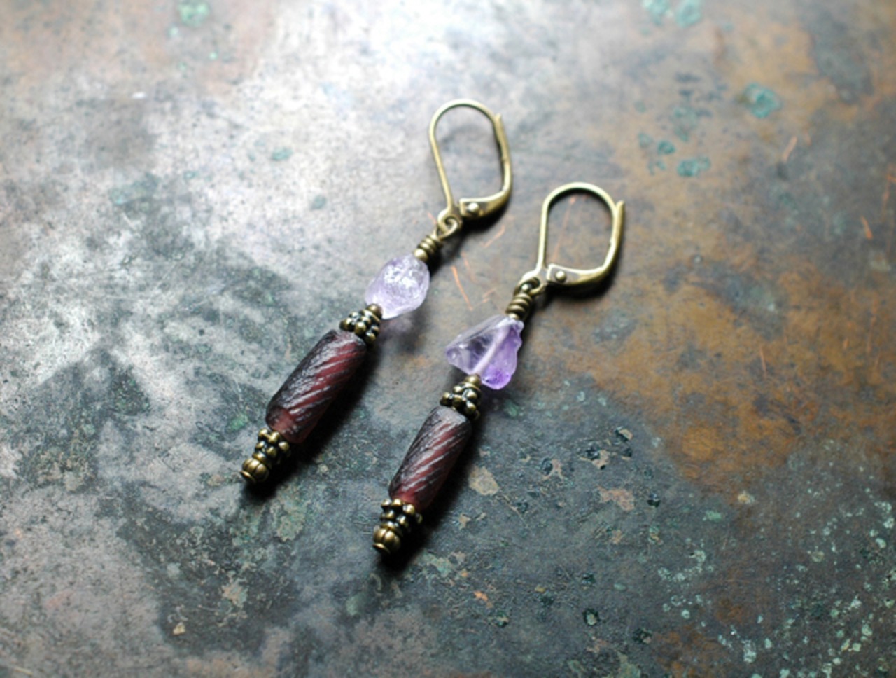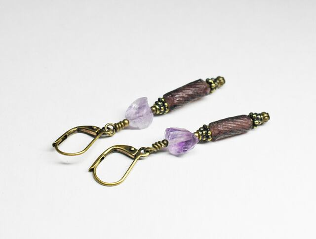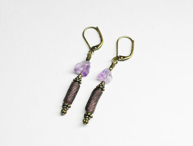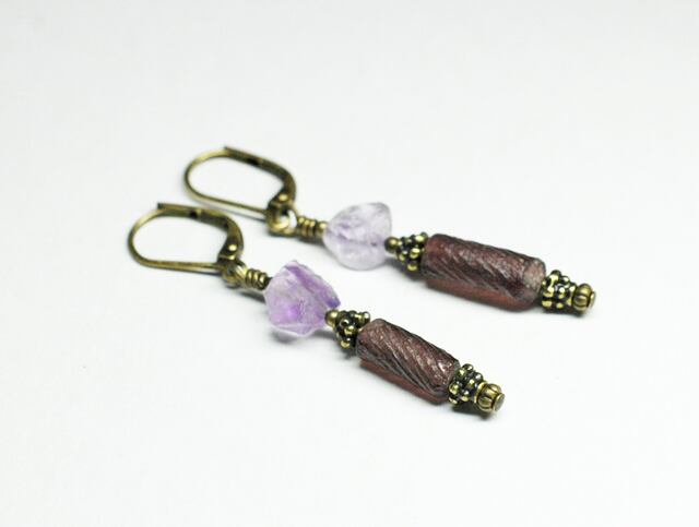濃いパープルのローマングラスと、ラフロックなアメジストを繋いだピアスです。