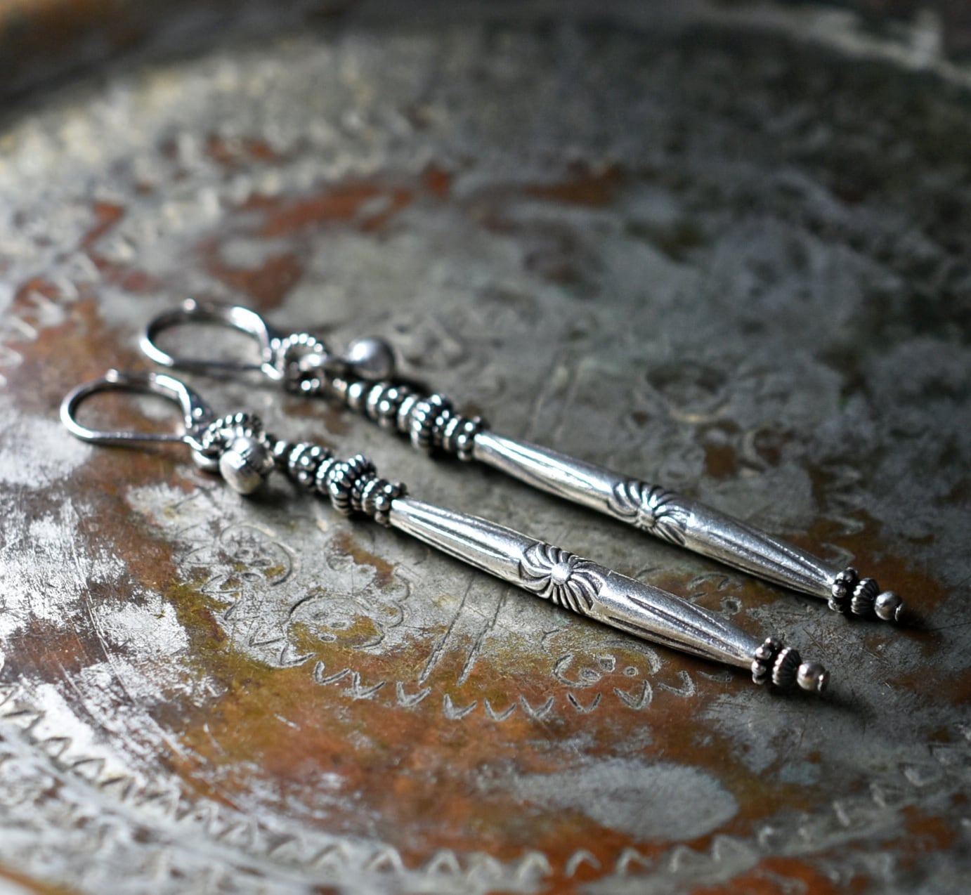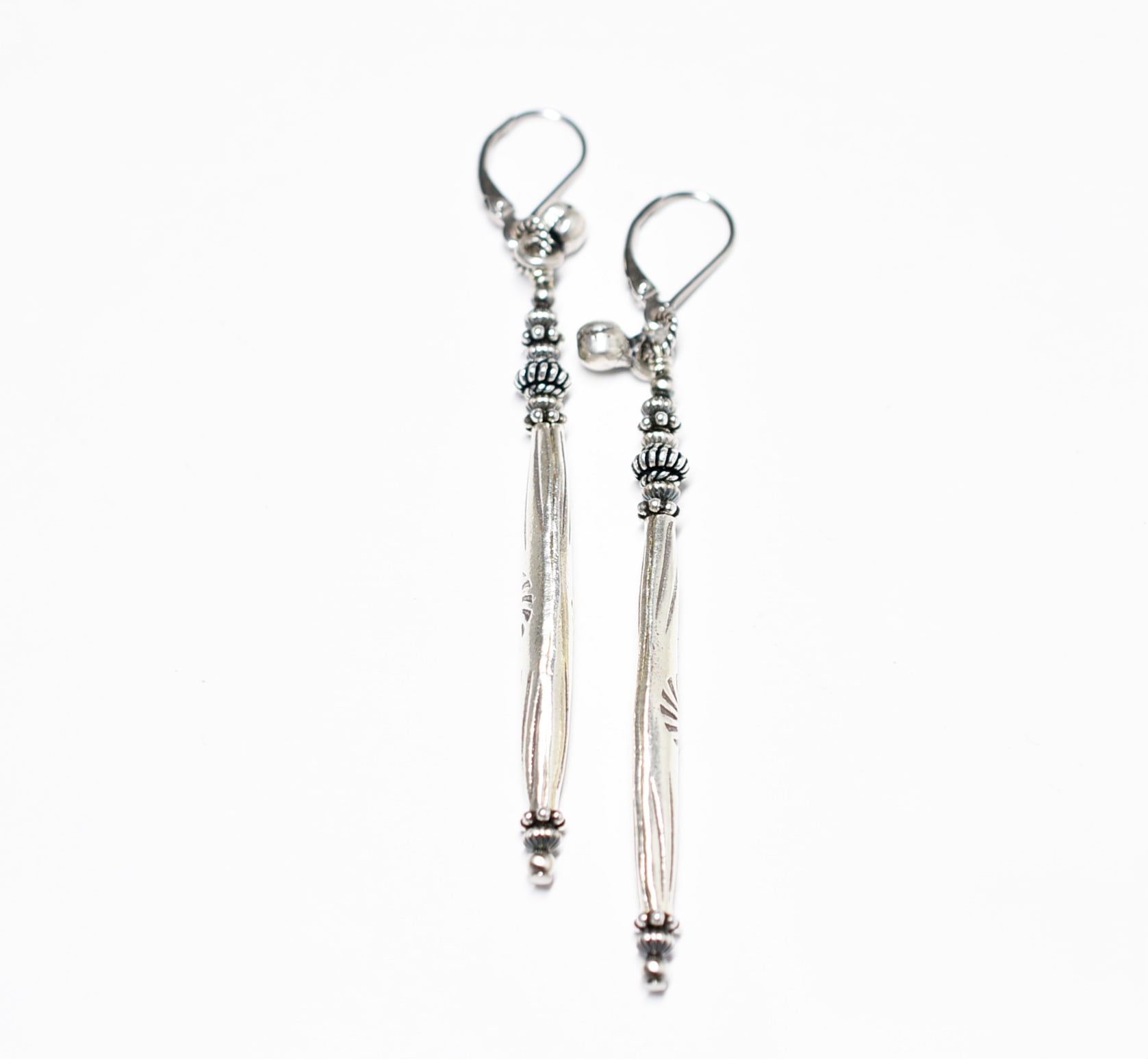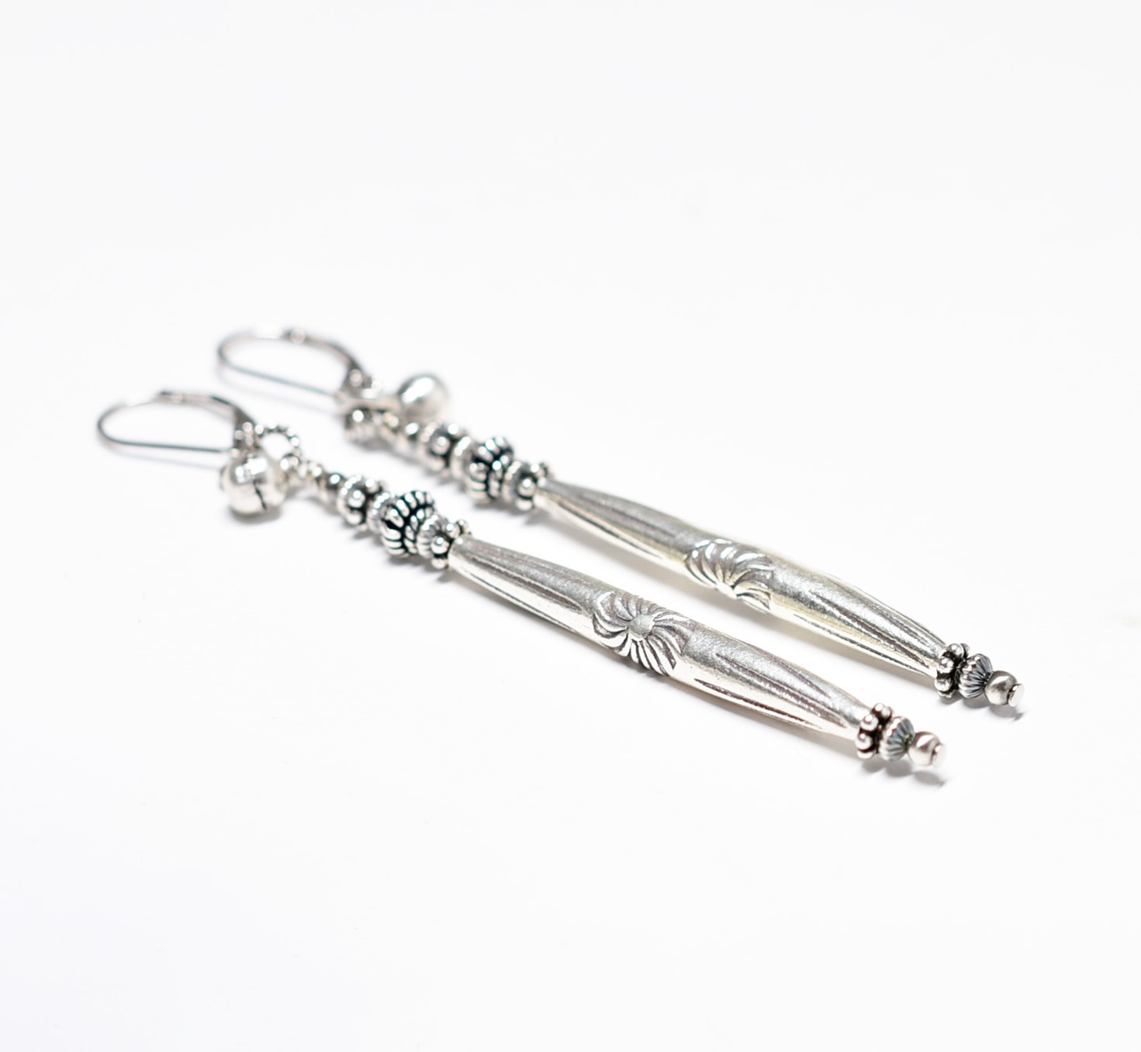 刻印入りロングカレンシルバーとハンドメイドシルバー、ナバホパール、インドシルバー鈴の長めなピアス
