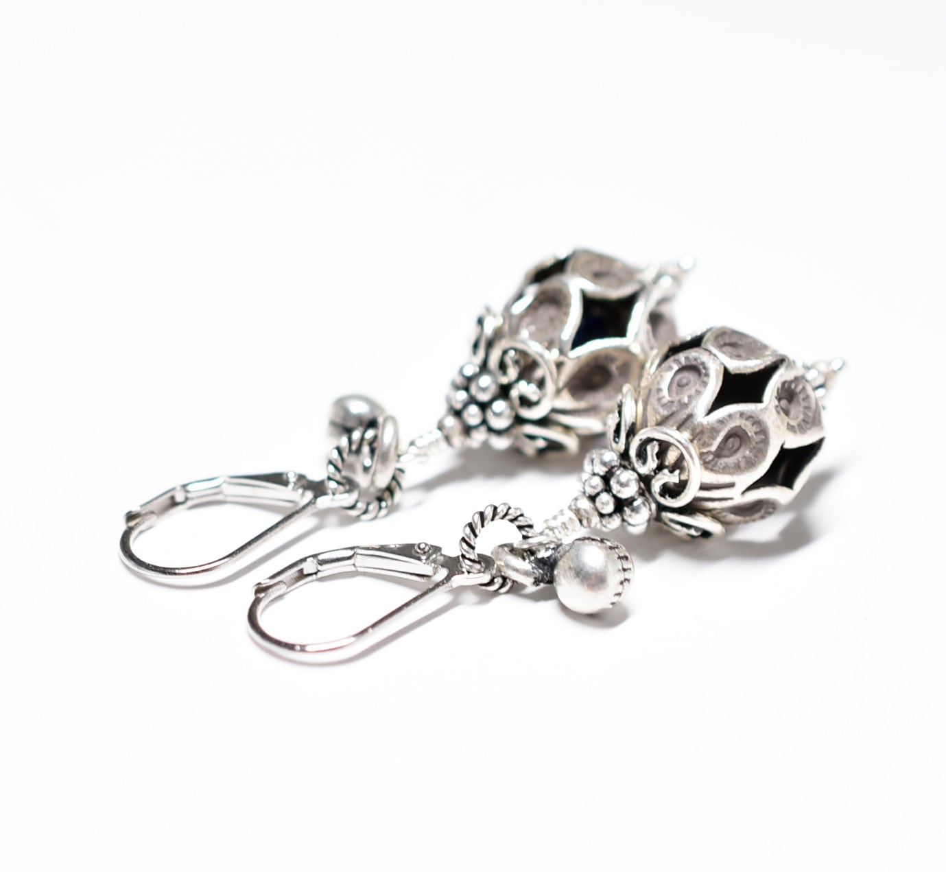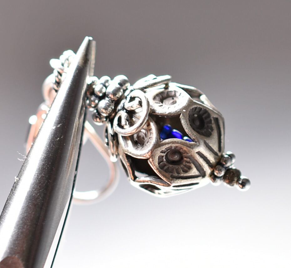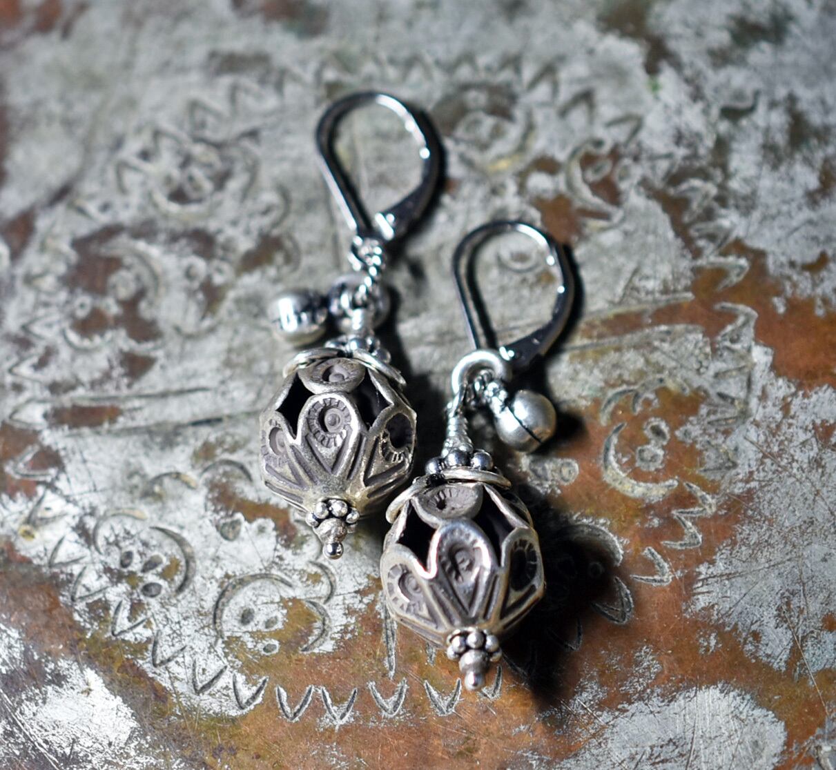 鳥かごの様なカレンシルバー、隠れブルービーズ、インドシルバー鈴のピアス