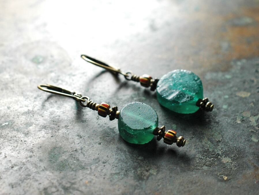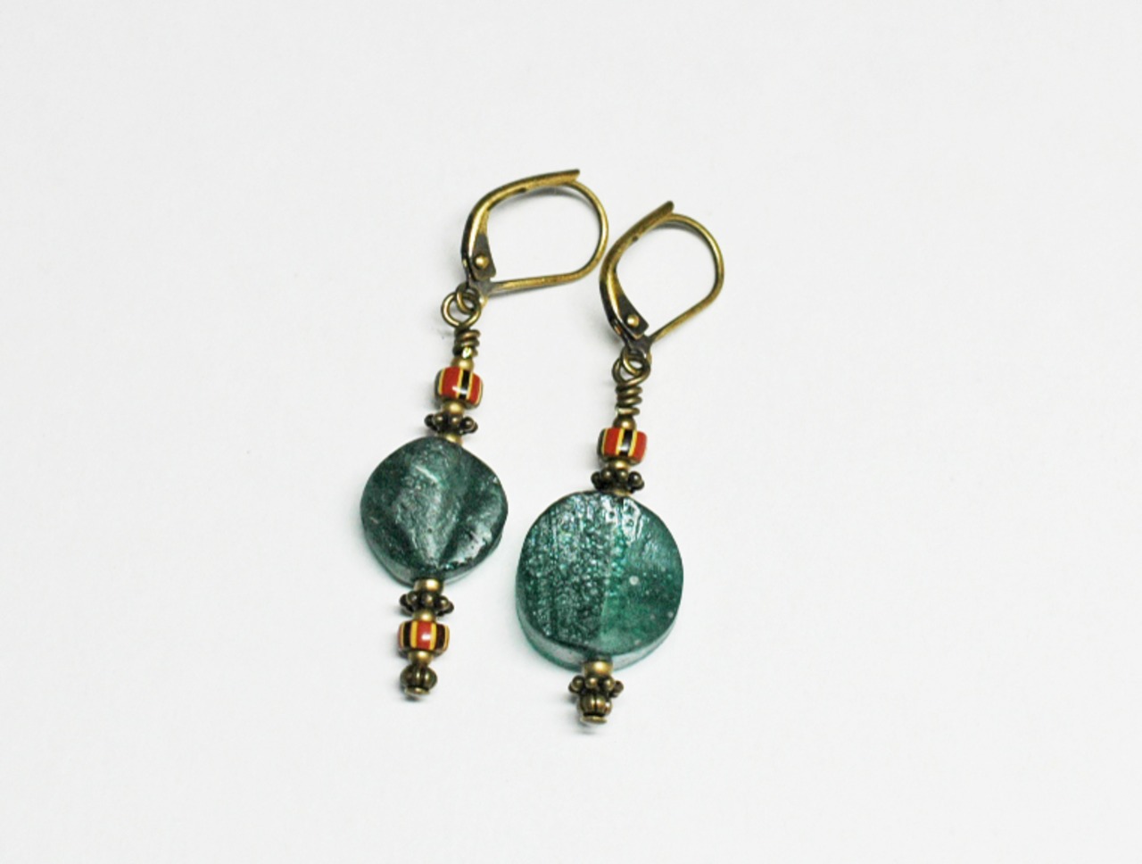 丸いローマングラスと、ストライプのベネチアビーズを繋いだピアスです。