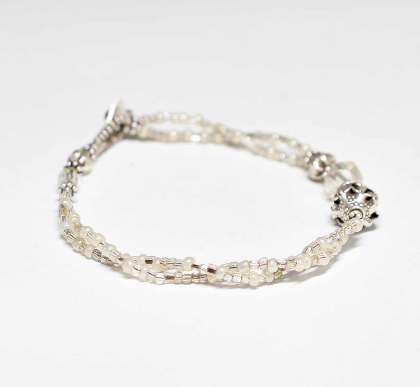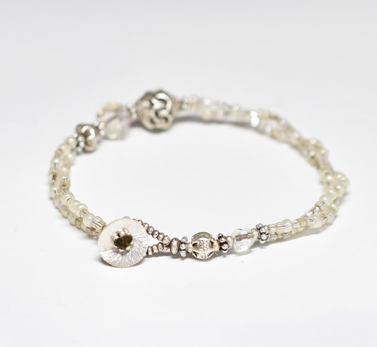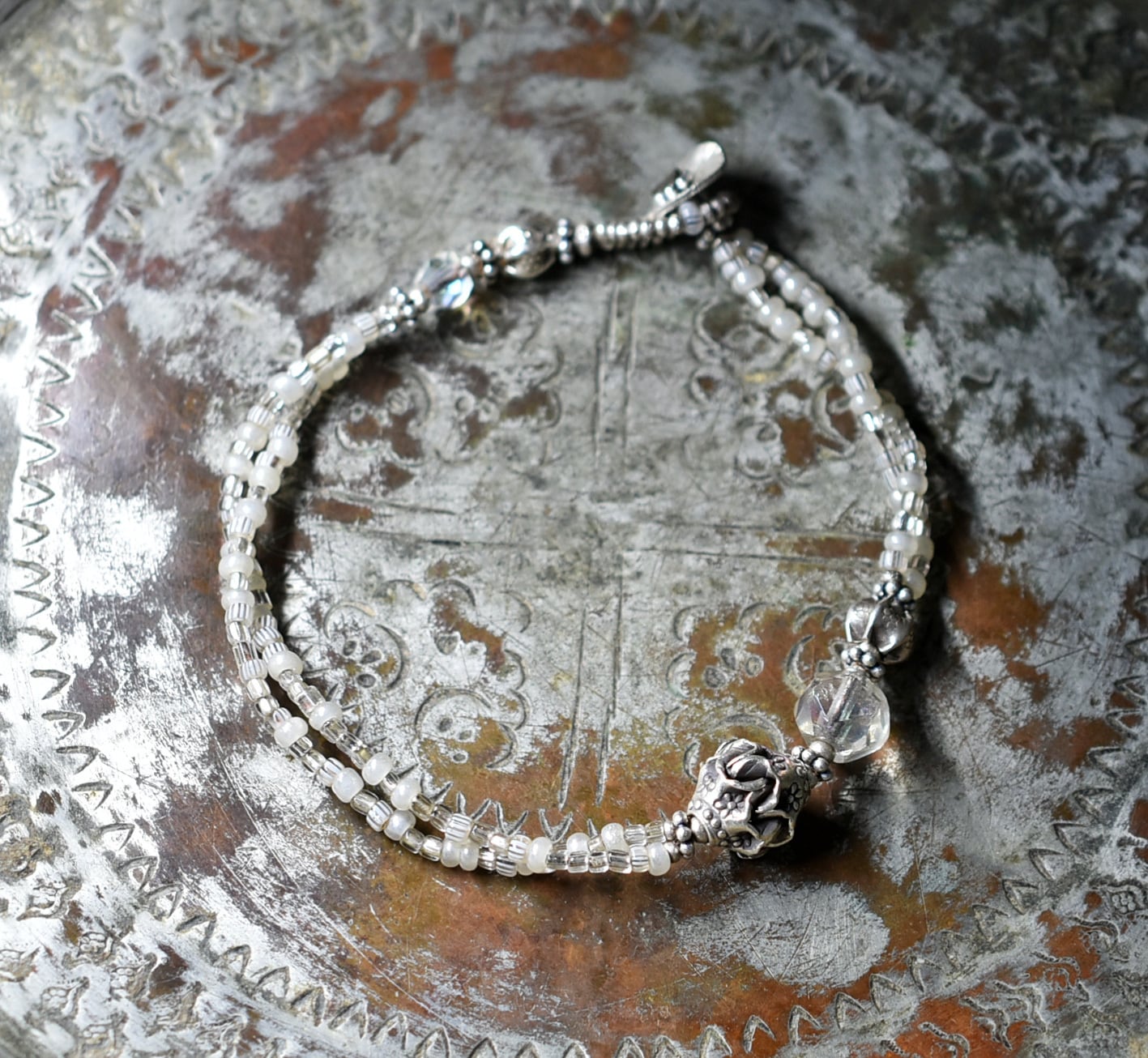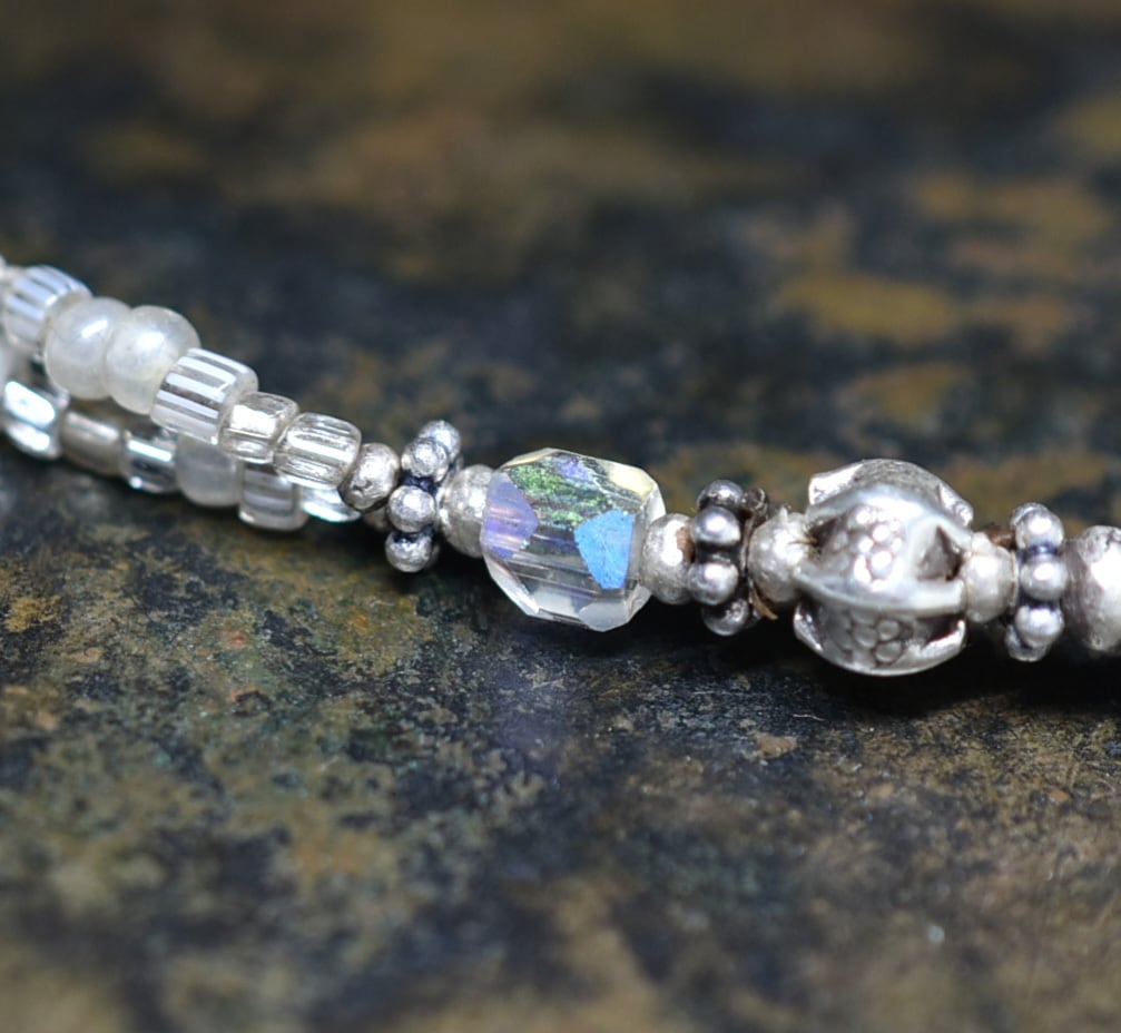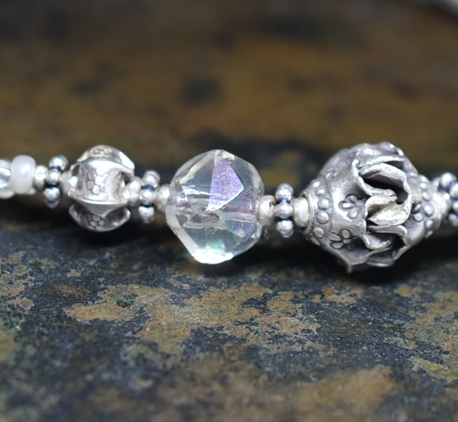 2種類のオーロラチェコビーズとカレンシルバー、グーズベリー、フランスのヴィンテージビーズ、カレンシルバーなどを繋いだ2連のブレスです。