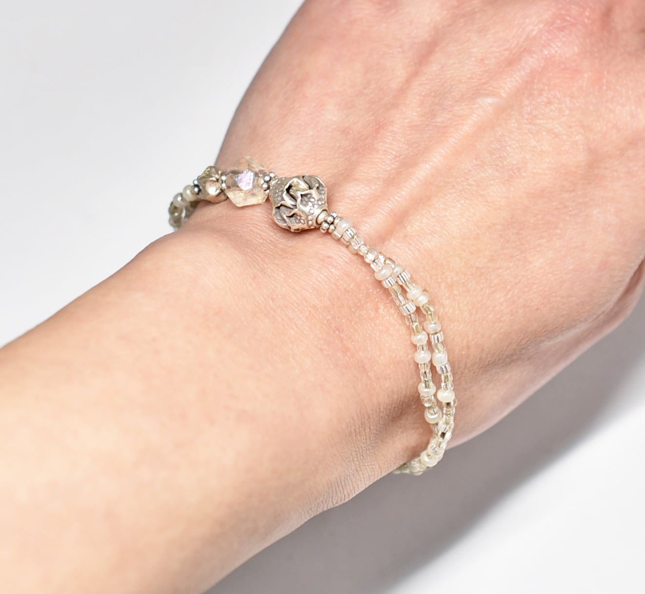 2種類のオーロラチェコビーズとカレンシルバー、グーズベリー、フランスヴィンテージビーズの2連ブレス